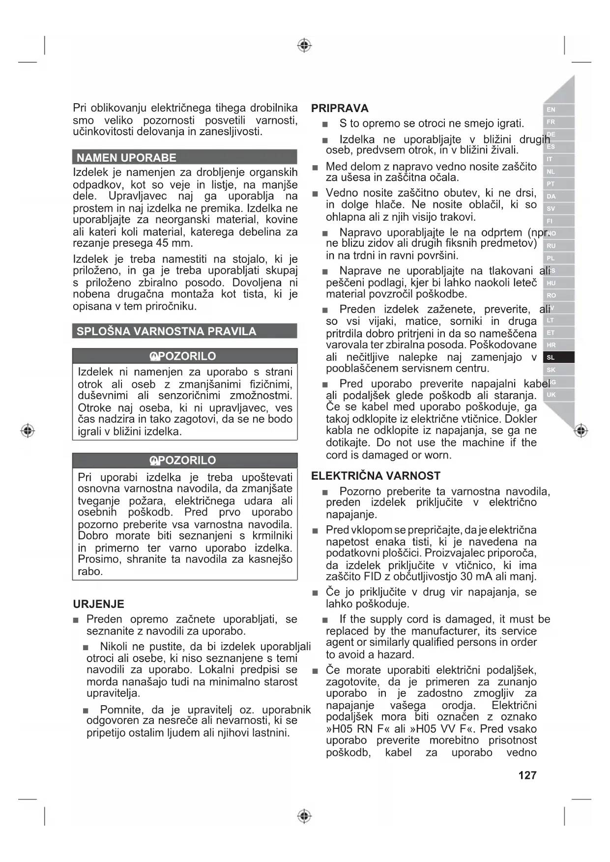 Pri oblikovanju električnega tihega drobilnika smo veliko pozornosti posvetili varnosti, učinkovitosti delovanja in zanesljivosti. NAMEN UPORABE Izdelek je namenjen za drobljenje organskih odpadkov, kot so veje in listje, na manjše dele. Upravljavec naj ga uporablja na prostem in naj izdelka ne premika. Izdelka ne uporabljajte za neorganski material, kovine ali kateri koli material, katerega debelina za rezanje presega 45 mm. Izdelek je treba namestiti na stojalo, ki je priloženo, in ga je treba uporabljati skupaj s priloženo zbiralno posodo. Dovoljena ni nobena drugačna montaža kot tista, ki je opisana v tem priročniku.