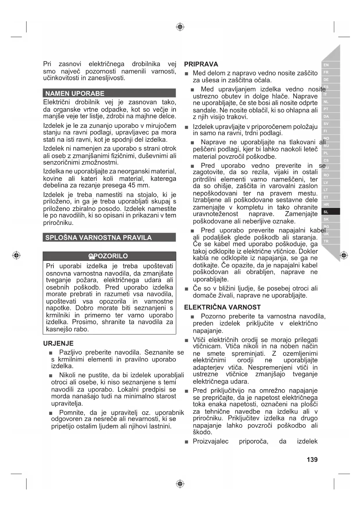 Pri zasnovi električnega drobilnika vej smo največ pozornosti namenili varnosti, učinkovitosti in zanesljivosti. NAMEN UPORABE Električni drobilnik vej je zasnovan tako, da organske vrtne odpadke, kot so večje in manjše veje ter listje, zdrobi na majhne delce. Izdelek je le za zunanjo uporabo v mirujočem stanju na ravni podlagi, upravljavec pa mora stati na isti ravni, kot je spodnji del izdelka. Izdelek ni namenjen za uporabo s strani otrok ali oseb z zmanjšanimi fi zičnimi, duševnimi ali senzoričnimi zmožnostmi. Izdelka ne uporabljajte za neorganski material, kovine ali kateri koli material, katerega debelina za rezanje presega 45 mm. Izdelek je treba namestiti na stojalo, ki je priloženo, in ga je treba uporabljati skupaj s priloženo zbiralno posodo. Izdelek namestite le po navodilih, ki so opisani in prikazani v tem priročniku.