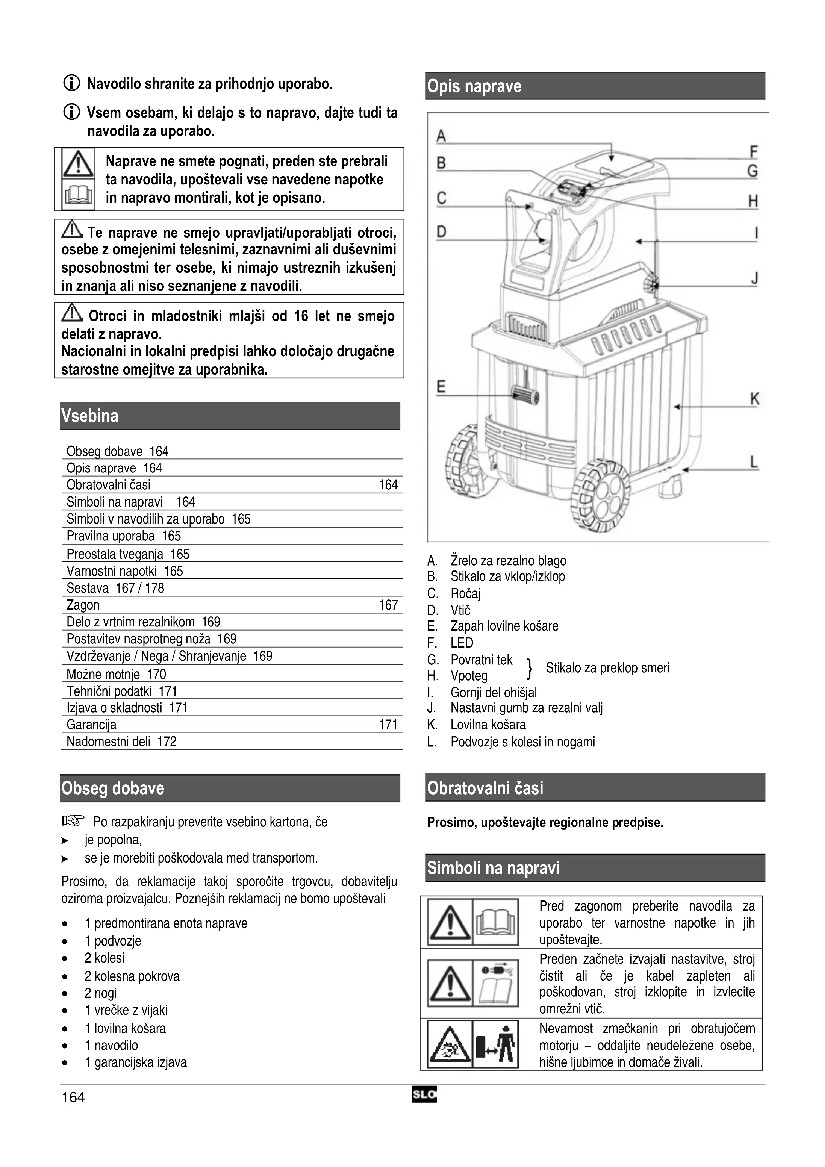 Záruka Prosíme, prečítajtě a rešpektujte priložené záručné prehlášenie a jeho podmienky.164 Navodilo shranite za prihodnjo uporabo. Vsem osebam, ki delajo s to napravo, dajte tudi ta navodila za uporabo. Naprave ne smete pognati, preden ste prebrali ta navodila, upoštevali vse navedene napotke in napravo montirali, kot je opisano. Te naprave ne smejo upravljati/uporabljati otroci, osebe z omejenimi telesnimi, zaznavnimi ali duševnimi sposobnostmi ter osebe, ki nimajo ustreznih izkušenj in znanja ali niso seznanjene z navodili. Otroci in mladostniki mlajši od 16 let ne smejo delati z napravo. Nacionalni in lokalni predpisi lahko določajo drugačne starostne omejitve za uporabnika. Vsebina Obseg dobave 164 Opis naprave 164 Obratovalni časi 164 Simboli na napravi 164 Simboli v navodilih za uporabo 165 Pravilna uporaba 165 Preostala tveganja 165 Varnostni napotki 165 Sestava 167 / 178 Zagon 167 Delo z vrtnim rezalnikom 169 Postavitev nasprotneg noža 169 Vzdrževanje / Nega / Shranjevanje 169 Možne motnje 170 Tehnični podatki 171 Izjava o skladnosti 171 Garancija 171 Nadomestni deli 172
