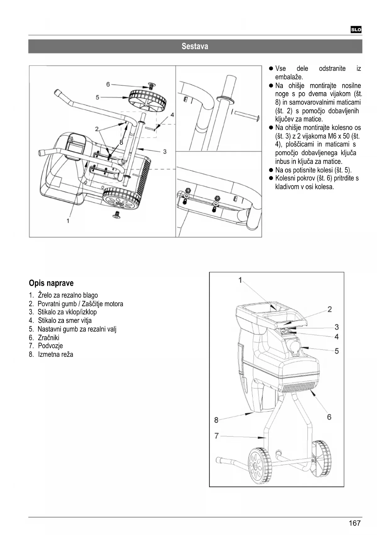 Pravilna uporaba K pravilni uporabi spada rezanje − vej vseh vrst do premera (odvisno od vrste in svežine lesa ) − ovenelega, vlažnega, že več dni skladiščenega vrtnega odpadka z vejami. Rezanje stekla, kovin, plastični delov, plastičnih vrečk, kamenja, odpadkov materiala, korenin z zemljo, odpadkov brez trdih materialov (npr. kuhinjski odpadki) ni dovoljeno. Vrtni rezalnik je primeren samo za zasebno uporabo v hiši in na vrtu. Vrtni rezalniki za zasebni domač in ljubiteljski vrt so tiste naprave, ki se ne uporabljajo v javnih nasadih, parkih, na športnih igriščih ter v kmetijstvu in gozdarstvu. K pravilni uporabi sodi tudi upoštevanje proizvajalčevih predpisov za obratovanje, vzdrževanje in zagon ter upoštevanje varnostnih napotkov iz navodil za uporabo. Kot nepravilna uporaba šteje vsaka drugačna uporaba. Proizvajalec ne prevzema odgovornosti za škode, ki izhajajo iz takšne uporabe - tveganje zanje prevzema izključno uporabnik. Samovoljno spreminjanje vrtnega rezalnika ima za posledico izključitev jamstva proizvajalca za vse vrste škode, ki zaradi tega nastane. Napravo lahko pripravljajo, uporabljajo in vzdržujejo le osebe, ki se na to spoznajo in so seznanjene z možnimi nevarnostmi. Zagon sme izvesti samo naše osebje ali servisna služba, ki smo jo za to pooblastili.