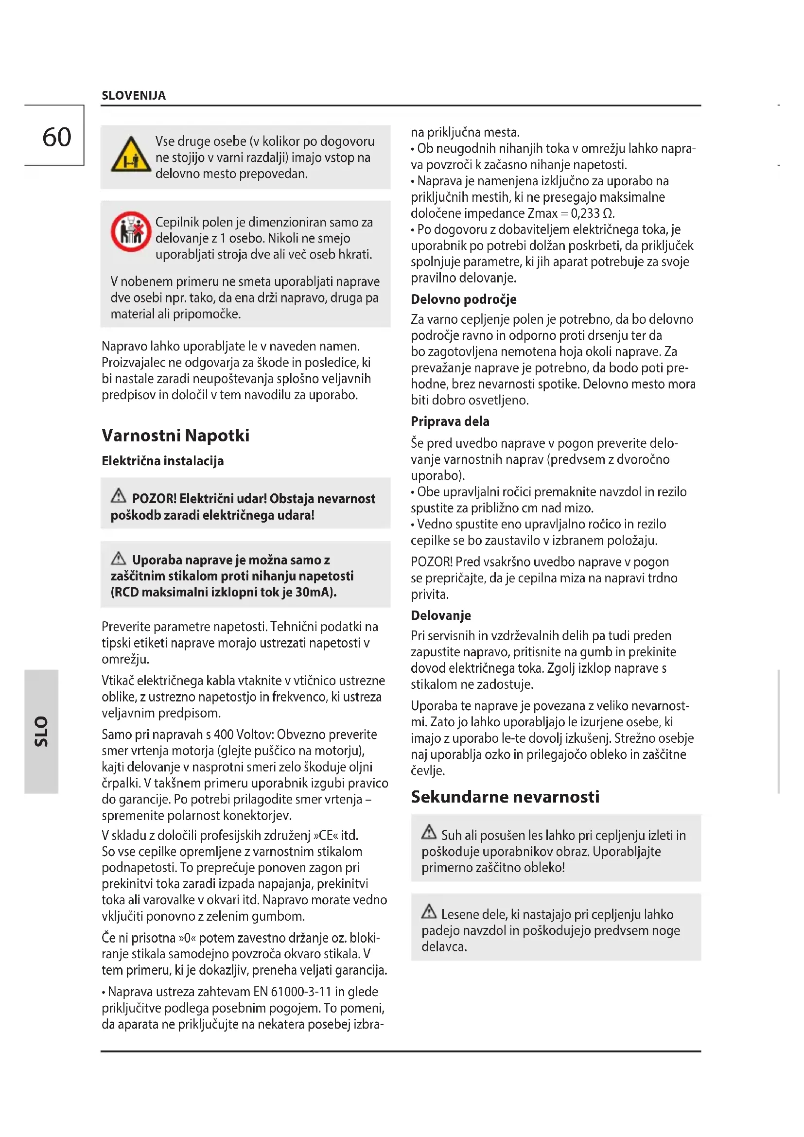 Cepilnik polen je dimenzioniran samo za delovanje z 1 osebo. Nikoli ne smejo uporablji stroja dve ali več oseb hkrati.