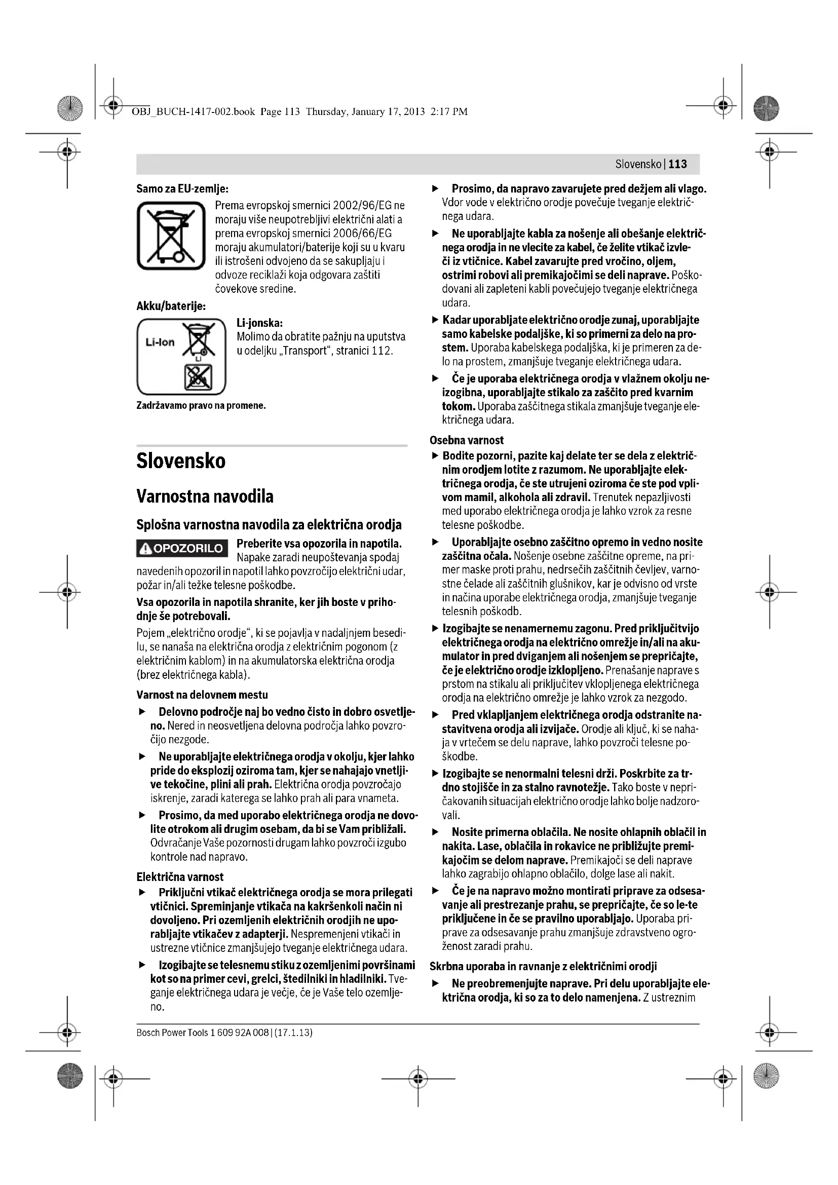 Zmogljivost rezanja/napolnjen akumulator (4 mm PVC) pribl. (samo za 1,5Ah akumulatorsko baterijo) m230 Teža po EPTA-Procedure 01/2003 kg 1,0 Dr. Egbert Schneider Senior Vice President Engineering Helmut Heinzelmann Head of Product Certification PT/ETM9 LED Kapaciteta Trajno sveti 3 x zelena ≥ 2/3 Trajno sveti 2 x zelena ≥ 1/3 Trajno sveti 1 x zelena <1/3 Utripajoča luč 1 x zelena Rezerva OBJ_BUCH-1417-002.book Page 115 Thursday, January 17, 2013 2:17 PM116 | Slovensko 1 609 92A 008 | (17.1.13) Bosch Power Tools – Vtaknite tanek, stabilni predmet (npr. žebelj) v odprto lu- knjo, da bi blokirali rezalni nož. – Sprostite vijak za pritrditev rezalnega noža 11. – Odstranite predmet, ki ste ga uporabili za blokiranje rezal- nega noža. – Rahlo privzdilnite rezalni nož in ga potegnite navzdol ven. – Nov rezilni nož vstavite v prijemalo orodja tako, da je zbru- šen rob obrnjen v smeri navzven. Pri tem pazite na to, da se rezalni nož zatakne v prijemalo orodja. – Ponovno zategnite vijak za pritrditev rezila. – Postavite zaščitno pločevino 3 ponovno na debelino mate- riala, ki jo želite rezati in ponovno zategnite narebričeni vi- jak 1. Delovanje Pred začetkom kakršnihkoli del na električnem orodju (na primer vzdrževanje, zamenjava orodja in podobno) kakor tudi med transportiranjem in shranjevanjem je treba iz električnega orodja odstraniti akumulator. Pri nenamernem aktiviranju vklopno/izklopnega stikala obstaja nevarnost telesnih poškodb. Zagon Namestitev akumulatorske baterije Uporabljajte samo originalne litijevo-ionske akumula- torje znamke Bosch z napetostjo, ki je navedena na tip- ski ploščici Vašega električnega orodja. V primeru upo- rabe drugih akumulatorjev lahko pride do telesnih po- škodb ali požara. Opozorilo: Uporaba akumulatorjev, ki niso primerni za Vaše električno orodje, lahko povzroči nepravilno delovanje ali pa poškodbe na električnem orodju. – Napolnjeno akumulatorsko baterijo 6 vstavite v ročaj, kjer mora slišno zaskočiti in biti poravnana z ročajem. Vklop/izklop –Za vklop električnega orodja potisnite vklopno/izklopno stikalo 4 naprej, tako da se na stikalu prikaže „I“. –Za izklop električnega orodja potisnite vklopno/izklopno stikalo 4 nazaj, tako se na stikalu prikaže „0“. Da bi privarčevali z energijo, vklopite električno orodje le ta- krat, ko ga boste uporabljali. Litijevo-ionski akumulator je s sistemom „Electronic Cell Pro- tection (ECP)“ zaščiten pred popolnim izpraznjenjem. Pri iz- praznjenem akumulatorju se električno orodje s pomočjo za- ščitnega stikala izklopi: vstavno orodje se ne premika več. Opozorilo: Če se električno orodje izklopi avtomatsko zaradi izpraznjene ali pregrete akumulatorske baterije, potem izklo- pite električno orodje z vklopno/izklopnim stikalom 4. Pred ponovnim vklopom električnega orodja morate napolniti aku- mulatorsko baterijo ali pa pustiti, da se ohladi. V nasprotnem primeru lahko akumulatorsko baterijo poškodujete. Navodila za delo Nikoli ne obremenjujte električnega orodja do te mere, da bi se ustavilo. Med obratovanjem se nikoli ne smete dotakniti rezal- nega noža 10. Rezalna moč električnega orodja je odvisna od materialov, ki jih želite rezati ter stanja napolnjenosti akumulatorske bateri- je. Povečan pomik glede na polnjenje akumulatorske baterije ze- lo zmanjša zmogljivost. Poskbite za to, da bo rezalni nož vedno prost in očiščen od ostankov materiala. Vodilna tirnica 12 se pri rezanju ne sme zatakniti in mora biti naravnana paralelno k rezalni površini. Pri nepravilni uporabi postane rezalni nož neoster. Tanki materiali kot npr. blago se lahko pri rezanju povlečejo v električno orodje in se zataknejo. Če želite tovrstne materiale dobro rezati, jih ne smete preveč potiskati. Pri rezanju pazite na to, da bodo dobro napeti ter rezajte počasi. Ne odstranjujte med obratovanjem materiala, ki se je povlekel in pred tem opravilom obvezno izklopite električno orodje z vklopno/izklopnim stikalom 4. Rezultate reza lahko najbolje optimirate s praktičnimi preizku- si. Nastavitev zaščitne pločevine Električnega orodja nikoli ne up or abl jaj te b rez zaš čitne pločevine 3. Da bi se optimalno zaščitili pred poškodbami prstov, morate pred vsakim delovnim postopkom nastaviti zaščitno pločevi- no na debelino materiala, ki ga želite rezati. – Sprostite narebričeni vijak 1. – Nastavite zaščitno pločevino 3 tako, da rahlo nasede na material, ki ga režete. – Ponovno zategnite narebričeni vijak 1. Opozorilo: Po vsaki uporabi električnega orodja in preden bo- ste opravili preizkus ali vzdrževanje, postavite zaščitno ploče- vino 3 do konca navzdol. Označitev rezalne linije „Cut Control“ Rdeča linija na zaščitnem pokrovu (označitev rezalne linije „Cut Control“ 2) vam prikazuje rezalno linijo rezalnega noža