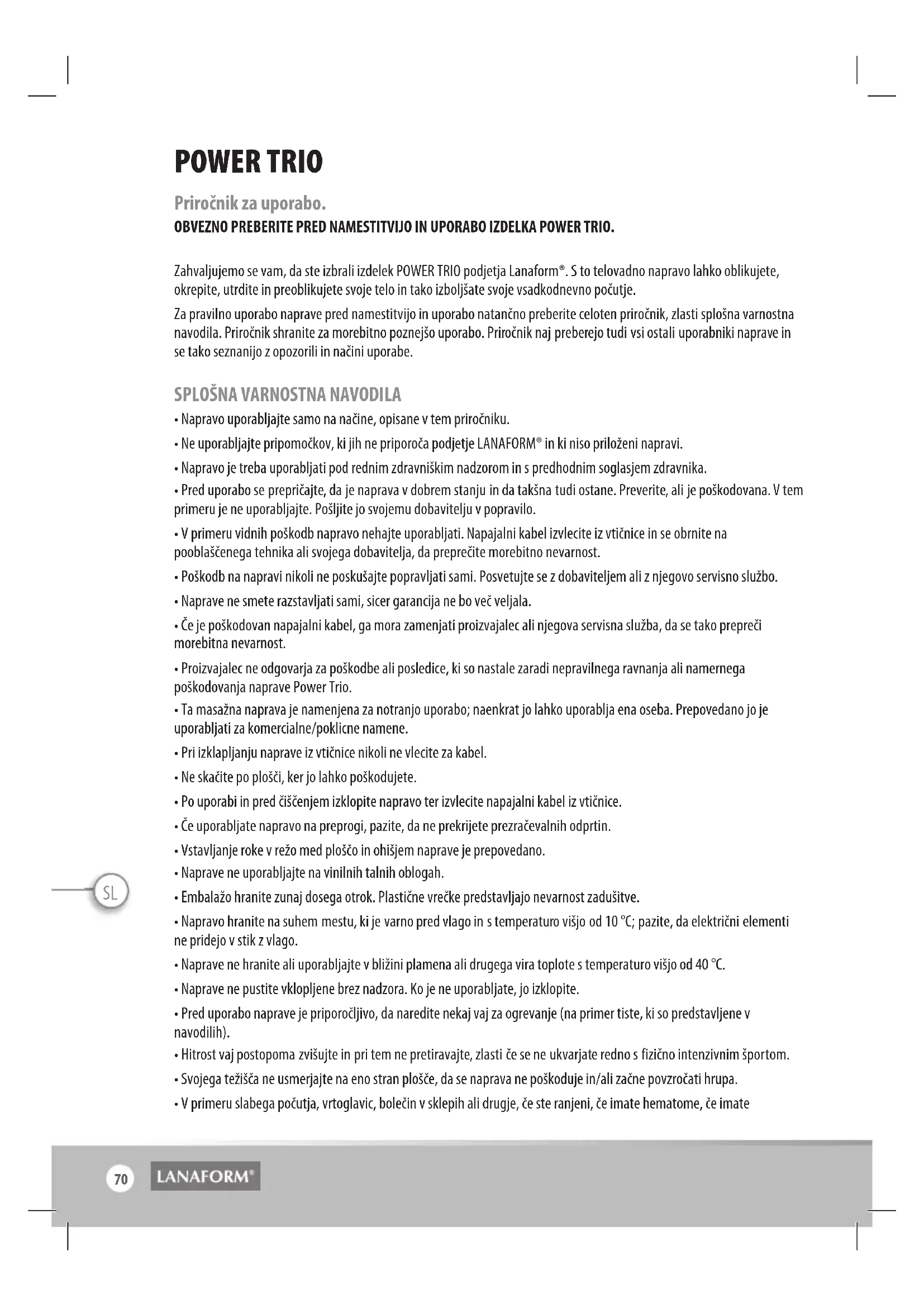 - Ko ne boste več uporabljali aparata, ga odstranite na okolju ustrezen način in v skladu z zakonskimi predpisi. Power Trio 75SL OMEJENA GARANCIJA LANAFORM® jamči, da ta izdelek nima nobene napake v materialu in izdelavi, in sicer od datuma nakupa dalje za obdobje dveh let, z izjemo spodaj navedenih primerov. Garancija LANAFORM® ne krije škode, ki bi nastala zaradi normalne obrabe tega izdelka. Poleg tega garancija za ta LANAFORM®-ov izdelek ne krije škode, ki je posledica kakršnekoli zlonamerne ali nepravilne uporabe, nezgode, namestitve neodobrene dodatne opreme, modifikacije izdelka ali kakršnekoli druge situacije, na katero LANAFORM® ne more vplivati. LANAFORM® ne bo odgovarjal za kakršnokoli vrsto naključne, posledične ali posebne škode. Vse implicitne garancije za ustreznost izdelka so omejene na obdobje dveh let od datuma prvega nakupa, v kolikor je mogoče predložiti kopijo dokazila o nakupu. Po sprejemu bo LANAFORM® popravil ali zamenjal vaš aparat, odvisno od primera, in vam ga poslal nazaj. Garancija se izpolni samo preko servisnega centra LANAFORM®. V primeru, da je kakršnokoli vzdrževanje tega izdelka izvajala katerakoli druga oseba, ne pa servisni center LANAFORM®, se ta garancija izniči. 76AR Power Trio 77AR 78AR Power Trio 79AR 80AR Power Trio 81AR 82AR Power Trio 83AR 84AR Power Trio 8586Power Trio