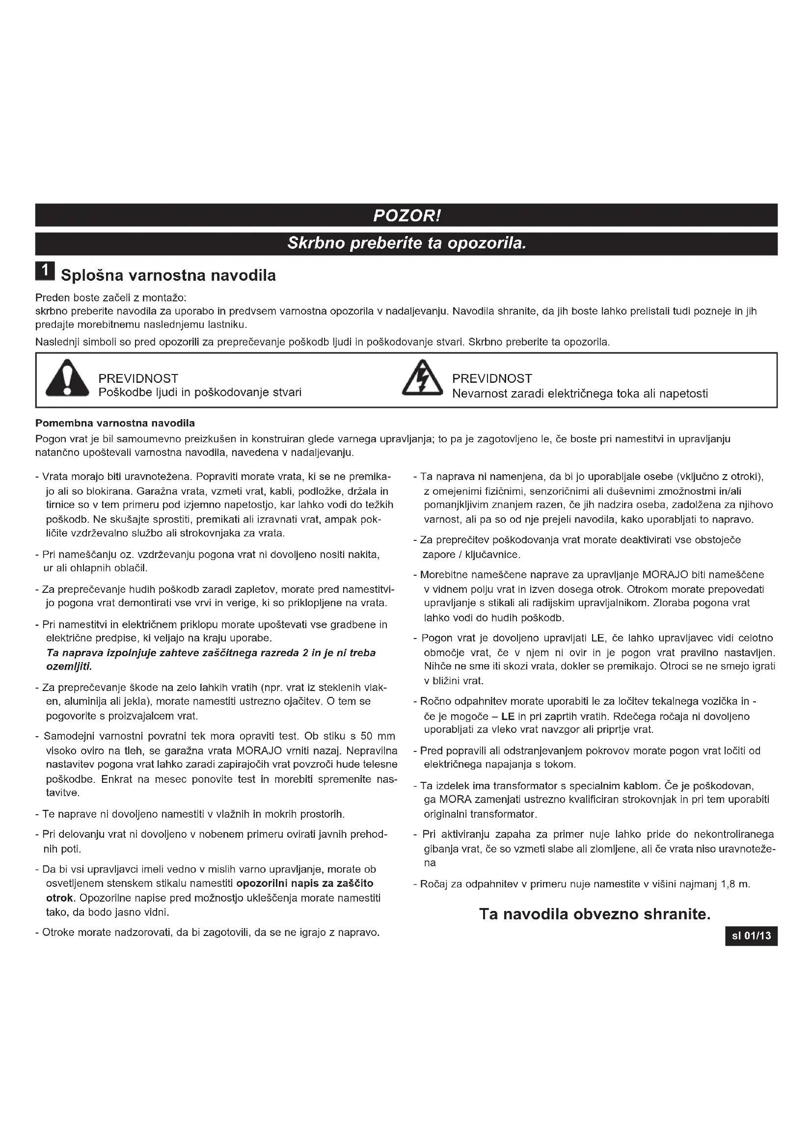 - 37 Izjava o skladnosti sl 01/13 Splošna varnostna navodila Preden boste začeli z montažo: skrbno preberite navodila za uporabo in predvsem varnostna opozorila v nadaljevanju. Navodila shranite, da jih boste lahko prelistali tudi pozneje in jih predajte morebitnemu naslednjemu lastniku. Naslednji simboli so pred opozorili za preprečevanje poškodb ljudi in poškodovanje stvari. Skrbno preberite ta opozorila. Pomembna varnostna navodila Pogon vrat je bil samoumevno preizkušen in konstruiran glede varnega upravljanja; to pa je zagotovljeno le, če boste pri namestitvi in upravljanju natančno upoštevali varnostna navodila, navedena v nadaljevanju. PREVIDNOST Poškodbe ljudi in poškodovanje stvari PREVIDNOST Nevarnost zaradi električnega toka ali napetosti p. 13