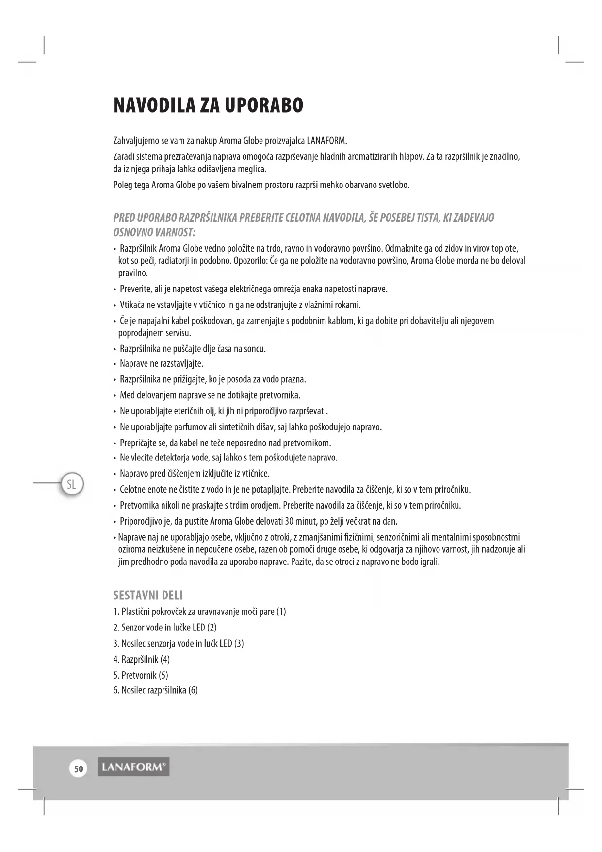 Zahvaljujemo se vam za nakup Aroma Globe proizvajalca LANAFORM. Zaradi sistema prezračevanja naprava omogoča razprševanje hladnih aromatiziranih hlapov. Za ta razpršilnik je značilno, da iz njega prihaja lahka odišavljena meglica. Poleg tega Aroma Globe po vašem bivalnem prostoru razprši mehko obarvano svetlobo. PRED UPORABO RAZPRŠILNIKA PREBERITE CELOTNA NAVODILA, ŠE POSEBEJ TISTA, KI ZADEVAJO OSNOVNO VARNOST: