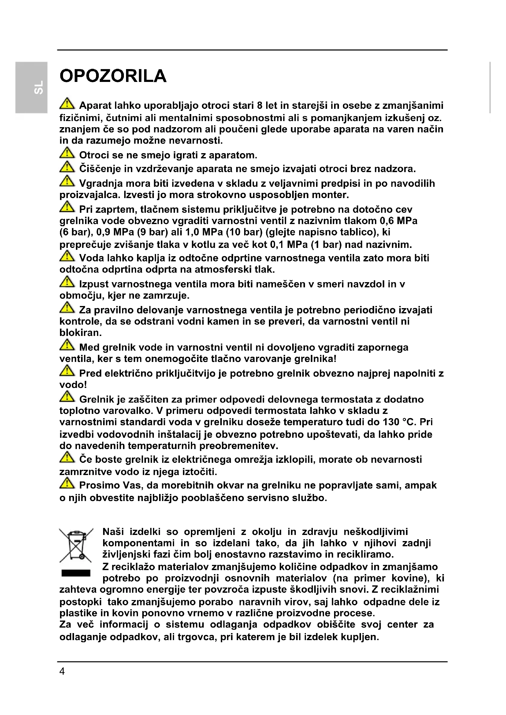 OPOZORILA Aparat lahko uporabljajo otroci stari 8 let in starejši in osebe z zmanjšanimi fizičnimi, čutnimi ali mentalnimi sposobnostmi ali s pomanjkanjem izkušenj oz. znanjem če so pod nadzorom ali poučeni glede uporabe aparata na varen način in da razumejo možne nevarnosti. Otroci se ne smejo igrati z aparatom. Čiščenje in vzdrževanje aparata ne smejo izvajati otroci brez nadzora. Vgradnja mora biti izvedena v skladu z veljavnimi predpisi in po navodilih proizvajalca. Izvesti jo mora strokovno usposobljen monter. Pri zaprtem, tlačnem sistemu priključitve je potrebno na dotočno cev grelnika vode obvezno vgraditi varnostni ventil z nazivnim tlakom 0,6 MPa (6 bar), 0,9 MPa (9 bar) ali 1,0 MPa (10 bar) (glejte napisno tablico), ki preprečuje zvišanje tlaka v kotlu za več kot 0,1 MPa (1 bar) nad nazivnim. Voda lahko kaplja iz odtočne odprtine varnostnega ventila zato mora biti odtočna odprtina odprta na atmosferski tlak. Izpust varnostnega ventila mora biti nameščen v smeri navzdol in v območju, kjer ne zamrzuje. Za pravilno delovanje varnostnega ventila je potrebno periodično izvajati kontrole, da se odstrani vodni kamen in se preveri, da varnostni ventil ni blokiran. Med grelnik vode in varnostni ventil ni dovoljeno vgraditi zapornega ventila, ker s tem onemogočite tlačno varovanje grelnika! Pred električno priključitvijo je potrebno grelnik obvezno najprej napolniti z vodo! Grelnik je zaščiten za primer odpovedi delovnega termostata z dodatno toplotno varovalko. V primeru odpovedi termostata lahko v skladu z varnostnimi standardi voda v grelniku doseže temperaturo tudi do 130 °C. Pri izvedbi vodovodnih inštalacij je obvezno potrebno upoštevati, da lahko pride do navedenih temperaturnih preobremenitev. Če boste grelnik iz električnega omrežja izklopili, morate ob nevarnosti zamrznitve vodo iz njega iztočiti. Prosimo Vas, da morebitnih okvar na grelniku ne popravljate sami, ampak o njih obvestite najbližjo pooblaščeno servisno službo.
