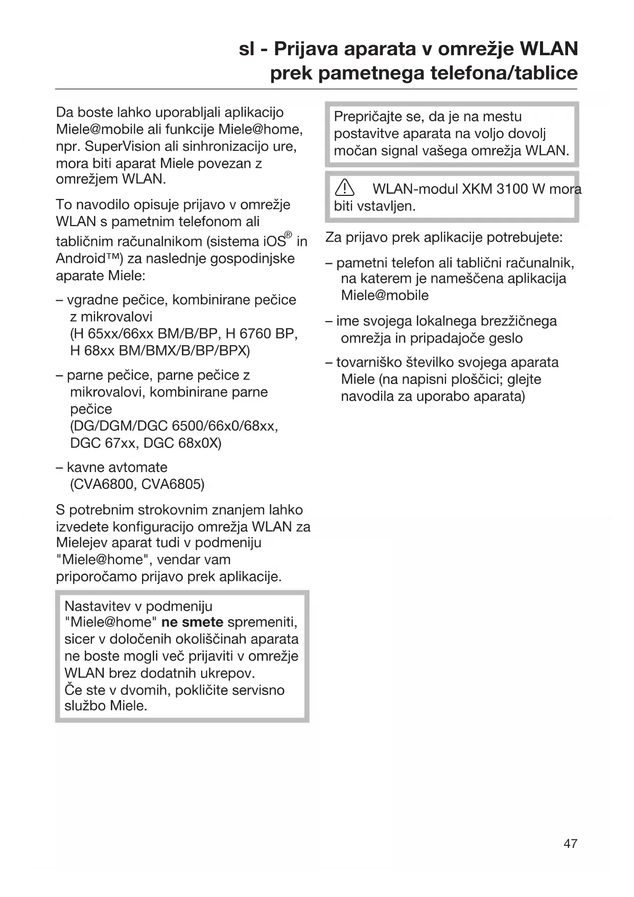 Android™) za naslednje gospodinjske aparate Miele: – vgradne pečice, kombinirane pečice z mikrovalovi (H65xx/66xxBM/B/BP, H6760BP, H68xxBM/BMX/B/BP/BPX) – parne pečice, parne pečice z mikrovalovi, kombinirane parne pečice (DG/DGM/DGC6500/66x0/68xx, DGC67xx, DGC68x0X) – kavne avtomate (CVA6800, CVA6805) S potrebnim strokovnim znanjem lahko izvedete konfiguracijo omrežja WLAN za Mielejev aparat tudi v podmeniju "Miele@home", vendar vam priporočamo prijavo prek aplikacije. Nastavitev v podmeniju "Miele@home" ne smete spremeniti, sicer v določenih okoliščinah aparata ne boste mogli več prijaviti v omrežje WLAN brez dodatnih ukrepov. Če ste v dvomih, pokličite servisno službo Miele. Prepričajte se, da je na mestu postavitve aparata na voljo dovolj močan signal vašega omrežja WLAN. WLAN-modul XKM 3100 W mora biti vstavljen. Za prijavo prek aplikacije potrebujete: – pametni telefon ali tablični računalnik, na katerem je nameščena aplikacija Miele@mobile – ime svojega lokalnega brezžičnega omrežja in pripadajoče geslo – tovarniško številko svojega aparata Miele (na napisni ploščici; glejte navodila za uporabo aparata)sl - Prijava aparata v omrežje WLAN prek pametnega telefona/tablice
