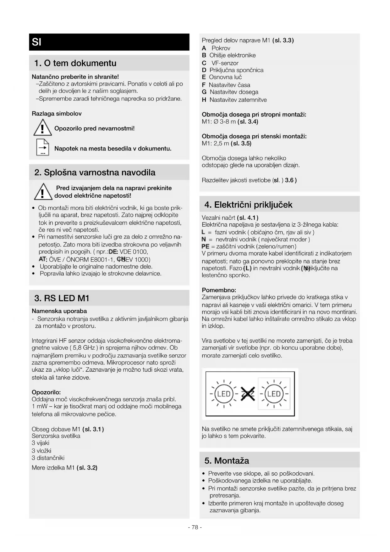 Namenska uporaba - Senzorska notranja svetilka z aktivnim javljalnikom gibanja za montažo v prostoru. Integrirani HF senzor oddaja visokofrekvenčne elektroma- gnetne valove ( 5,8 GHz ) in sprejema njihov odmev. Ob najmanjšem premiku v področju zaznavanja svetilke senzor zazna spremembo odmeva. Mikroprocesor nato sproži ukaz za „vklop luči“. Zaznavanje je možno tudi skozi vrata, stekla ali tanke zidove. Opozorilo: Oddajna moč visokofrekvenčnega senzorja znaša pribl. 1mW – kar je tisočkrat manj od oddajne moči mobilnega telefona ali mikrovalovne pečice. Obseg dobave M1 ( sl.3.1 ) Senzorska svetilka 3 vijaki 3 vložki 3 distančniki Mere izdelka M1 ( sl.3.2) !- 79 - Navodila za montažo