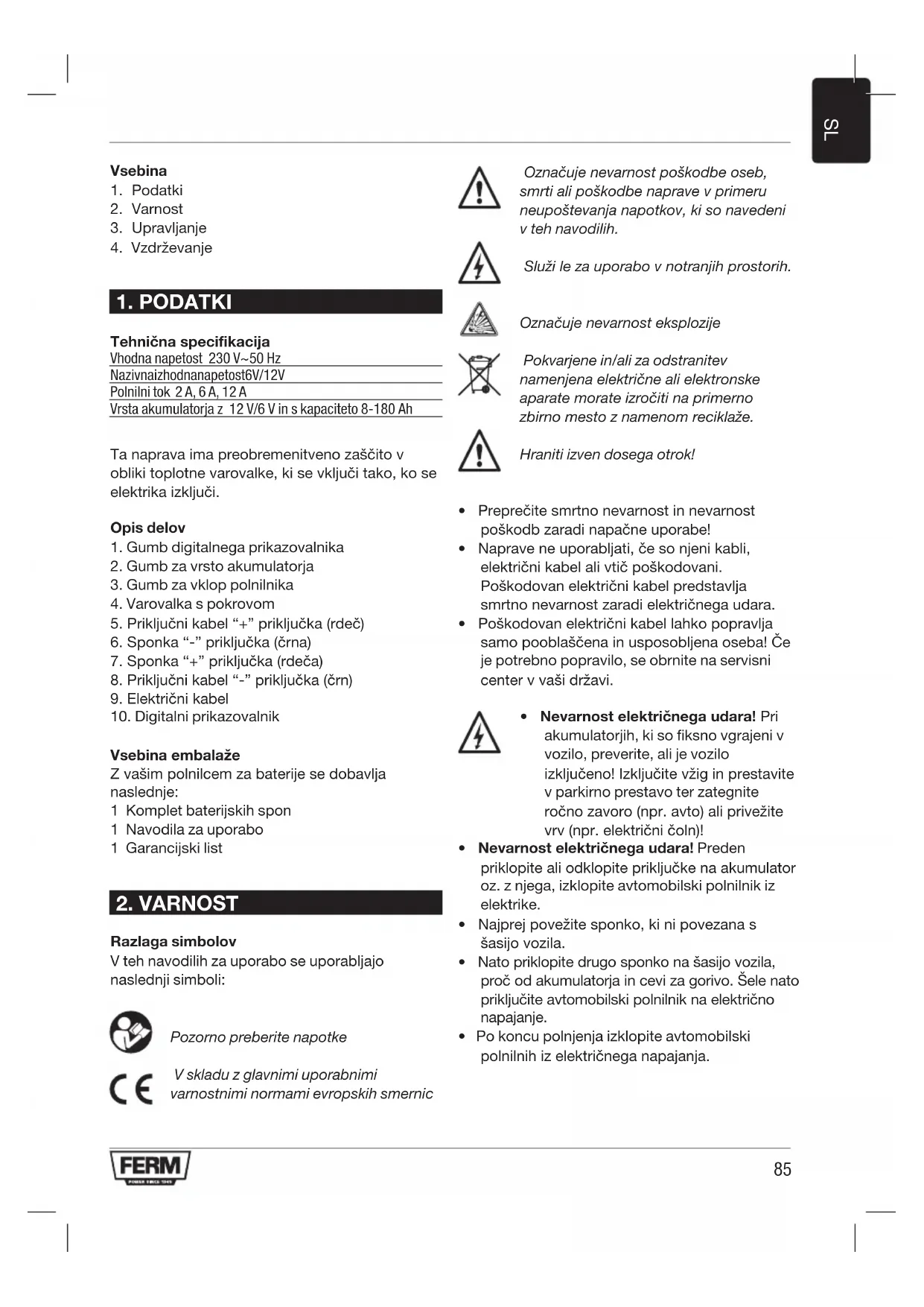 POZOR! Da se izognete elektrichi nevarnosti, morate polnilec priključiti na vir napetosti s podobno ozemljitvivo in nikoli ga ne smete izpostavlji at dežju ali snegu. Poškodovane kable mora takoj zamenjati strokovjak.