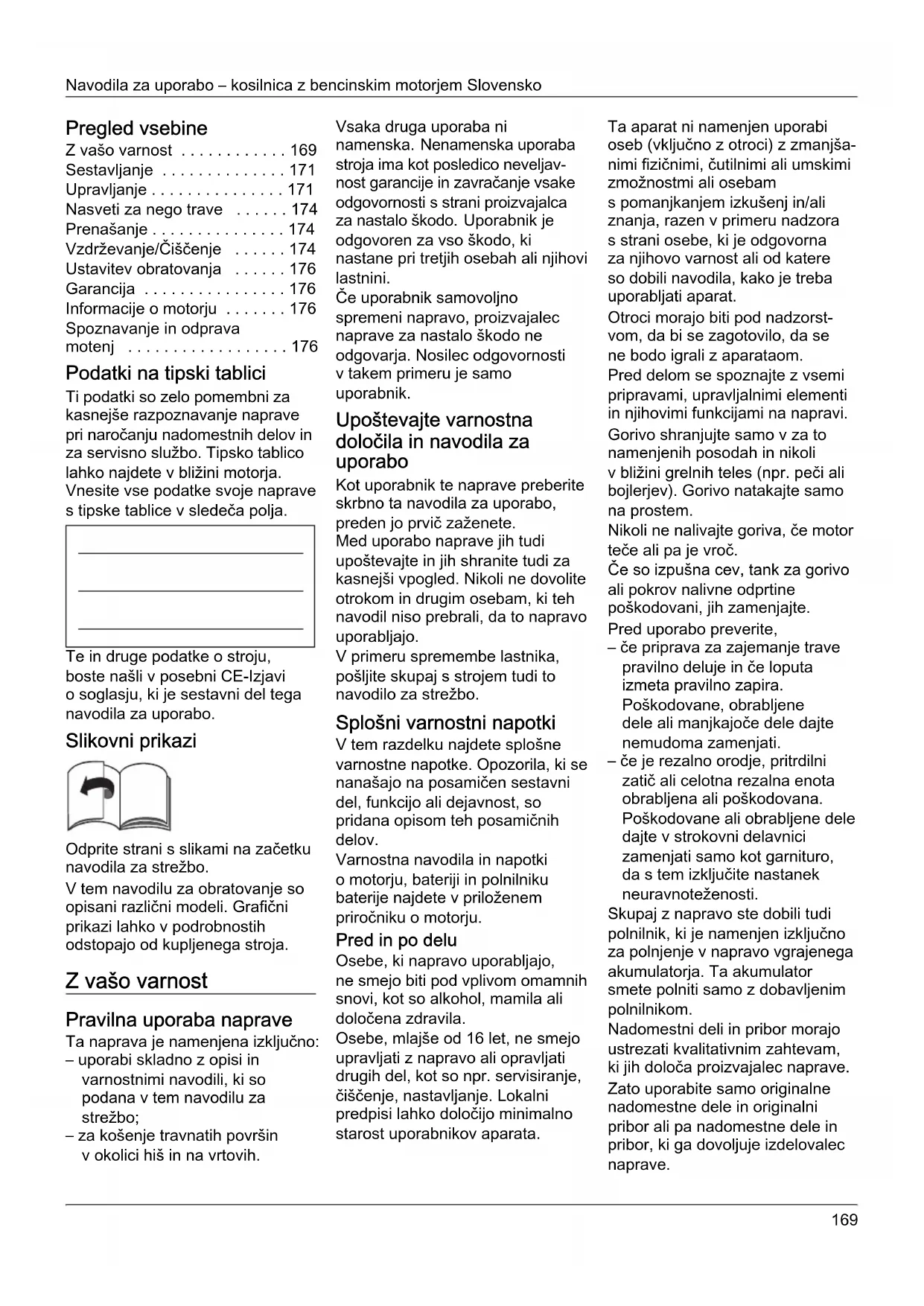 - Spoznavanje in odprava motenj Podatki na tipski tablici Ti podatki so zelo pomembni za kasnejše razpoznavanje naprave pri naročanju nadomestnih delov in za servisno službo. Tipsko tablico lahko najdete v bližini motorja. Vnesite vse podatke svoje naprave s tipske tablice v sledeča polja. Te in druge podatke o stroju, boste našli v posebni CE-Izjavi o soglasju, ki je sestavni del tega navodila za uporabo. Slikovni prikazi Odprite strani s slikami na začetku navodila za strežbo. V tem navodilu za obratovanje so opisani različni modeli. Grafični prikazi lahko v podrobnostih odstopajo od kupljenega stroja. Z vašo varnost Pravilna uporaba naprave Ta naprava je namenjena izključno: – uporabi skladno z opisi in varnostnimi navodili, ki so podana v tem navodilu za strežbo; – za košenje travnatih površin v okolici hiš in na vrtovih. Vsaka druga uporaba ni namenska. Nenamenska uporaba stroja ima kot posledico neveljav- nost garancije in zavračanje vsake odgovornosti s strani proizvajalca za nastalo škodo. Uporabnik je odgovoren za vso škodo, ki nastane pri tretjih osebah ali njihovi lastnini. Če uporabnik samovoljno spremeni napravo, proizvajalec naprave za nastalo škodo ne odgovarja. Nosilec odgovornosti v takem primeru je samo uporabnik. Upoštevajte varnostna določila in navodila za uporabo Kot uporabnik te naprave preberite skrbno ta navodila za uporabo, preden jo prvič zaženete. Med uporabo naprave jih tudi upoštevajte in jih shranite tudi za kasnejši vpogled. Nikoli ne dovolite otrokom in drugim osebam, ki teh navodil niso prebrali, da to napravo uporabljajo. V primeru spremembe lastnika, pošljite skupaj s strojem tudi to navodilo za strežbo. Splošni varnostni napotki V tem razdelku najdete splošne varnostne napotke. Opozorila, ki se nanašajo na posamičen sestavni del, funkcijo ali dejavnost, so pridana opisom teh posamičnih delov. Varnostna navodila in napotki o motorju, bateriji in polnilniku baterije najdete v priloženem priročniku o motorju. Pred in po delu Osebe, ki napravo uporabljajo, ne smejo biti pod vplivom omamnih snovi, kot so alkohol, mamila ali določena zdravila. Osebe, mlajše od 16 let, ne smejo upravljati z napravo ali opravljati drugih del, kot so npr. servisiranje, čiščenje, nastavljanje. Lokalni predpisi lahko določijo minimalno starost uporabnikov aparata. Ta aparat ni namenjen uporabi oseb (vključno z otroci) z zmanjša- nimi fizičnimi, čutilnimi ali umskimi zmožnostmi ali osebam s pomanjkanjem izkušenj in/ali znanja, razen v primeru nadzora s strani osebe, ki je odgovorna za njihovo varnost ali od katere so dobili navodila, kako je treba uporabljati aparat. Otroci morajo biti pod nadzorst- vom, da bi se zagotovilo, da se ne bodo igrali z aparataom. Pred delom se spoznajte z vsemi pripravami, upravljalnimi elementi in njihovimi funkcijami na napravi. Gorivo shranjujte samo v za to namenjenih posodah in nikoli v bližini grelnih teles (npr. peči ali bojlerjev). Gorivo natakajte samo na prostem. Nikoli ne nalivajte goriva, če motor teče ali pa je vroč. Če so izpušna cev, tank za gorivo ali pokrov nalivne odprtine poškodovani, jih zamenjajte. Pred uporabo preverite, – če priprava za zajemanje trave pravilno deluje in če loputa izmeta pravilno zapira. Poškodovane, obrabljene dele ali manjkajoče dele dajte nemudoma zamenjati. – če je rezalno orodje, pritrdilni zatič ali celotna rezalna enota obrabljena ali poškodovana. Poškodovane ali obrabljene dele dajte v strokovni delavnici zamenjati samo kot garnituro, da s tem izključite nastanek neuravnoteženosti. Skupaj z napravo ste dobili tudi polnilnik, ki je namenjen izključno za polnjenje v napravo vgrajenega akumulatorja. Ta akumulator smete polniti samo z dobavljenim polnilnikom. Nadomestni deli in pribor morajo ustrezati kvalitativnim zahtevam, ki jih določa proizvajalec naprave. Zato uporabite samo originalne nadomestne dele in originalni pribor ali pa nadomestne dele in pribor, ki ga dovoljuje izdelovalec naprave.Slovensko Navodila za uporabo – kosilnica z bencinskim motorjem Popravila naj izvede zmeraj samo ena strokovna delavnica. Med delom z napravo Pri delih z napravo oziroma na napravi nosite ustrezno obleko, kot so npr.:– varnostni škornji,– dolge hlače,– tesno se prilagajoče oblačilo,– zaščita sluha,– varnostna očala.Vse varnostne priprave na napravi morajo biti neoporečne in jih ne smete odstraniti.Varnostnih priprav se na napravi ne sme spreminjati.Napravo poganjajte samo, če ustreza tehničnem stanju, ki ga predpisuje proizvajalec in kakšno je bilo ob dostavi.Nikoli ne spreminjajte nastavitev motorja, ki je bil tovarniško nastavljen.Ob delu se izogibajte odprtemu ognju, iskrenju in ne kadite. Pred vsakim vzdrževalnim delom na napravi Za preprečitev nastanka poškodb pred vsemi deli na napravi (npr. pred vzdrževalnimi, nastavitvenimi deli) in pred prevažanjem naprave (npr. dviganjem in nošenjem)– ugasnite motor,– izvlecite vžigalni ključ (če obstaja),– počakajte, da se vsi gibljivi deli naprave ustavijo in se je motor pohladil,– izvlecite vtič z vžigalne svečke, da s tem preprečite nehoten zagon motorja,– Odstranite baterijo za zagon z motorja,– upoštevajte tudi dodatna navodila iz priročnika za motor. Po delih na napravi Nikoli ne zapustite stroja, preden izklopite motor in – če obstaja – izvlečete vžigalni ključ. Varnostne naprave Slika 1 Nevarnost Nikoli ne uporabljajte naprave, če so varnostne priprave na napravi poškodovane ali pa so odstranjene. Varnostna ročica (1) Varnostna ročica je namenjena za varovanje oseb, če je potrebno v sili motor in rezalnik takoj zaustaviti. Te funkcije ne smete poizkusiti zaobiti. Loputa za izmet (2) ali odbojna zaščita (3) Loputa za izmet in odbojna zaščita vas varujeta pred poškodbami zaradi rezalnika ali pred izmetom trdih predmetov iz rezalnika. Napravo se sme poganjati samo, če sta ti dve pripravi montirani. Simboli na napravi Na nap