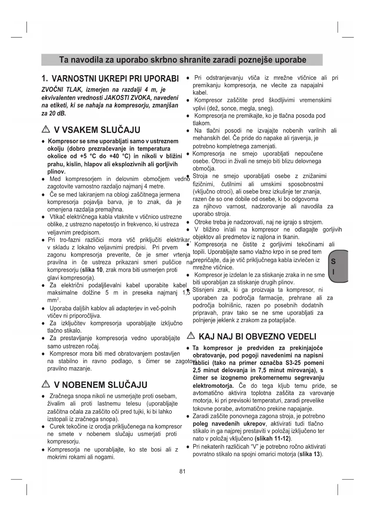 - Ta kompresor je predviden za prekinjacoche obratovanje, pod pogoji navedenimi na napisni tablici (tako na primer oznacba S3-25 pomeni 2,5 minut delovanja in 7,5 minut mirovanja), s cimer se izognemo prekomernemu segrevanju elektromotorja. Ce do tega klub temu pride, se avtomaticno aktivira toplotna zašcita za varovanje motorja, ki pri previsoki temperaturi, zaradi prevelike tokovne porabe, avtomaticno prekine napajanje.