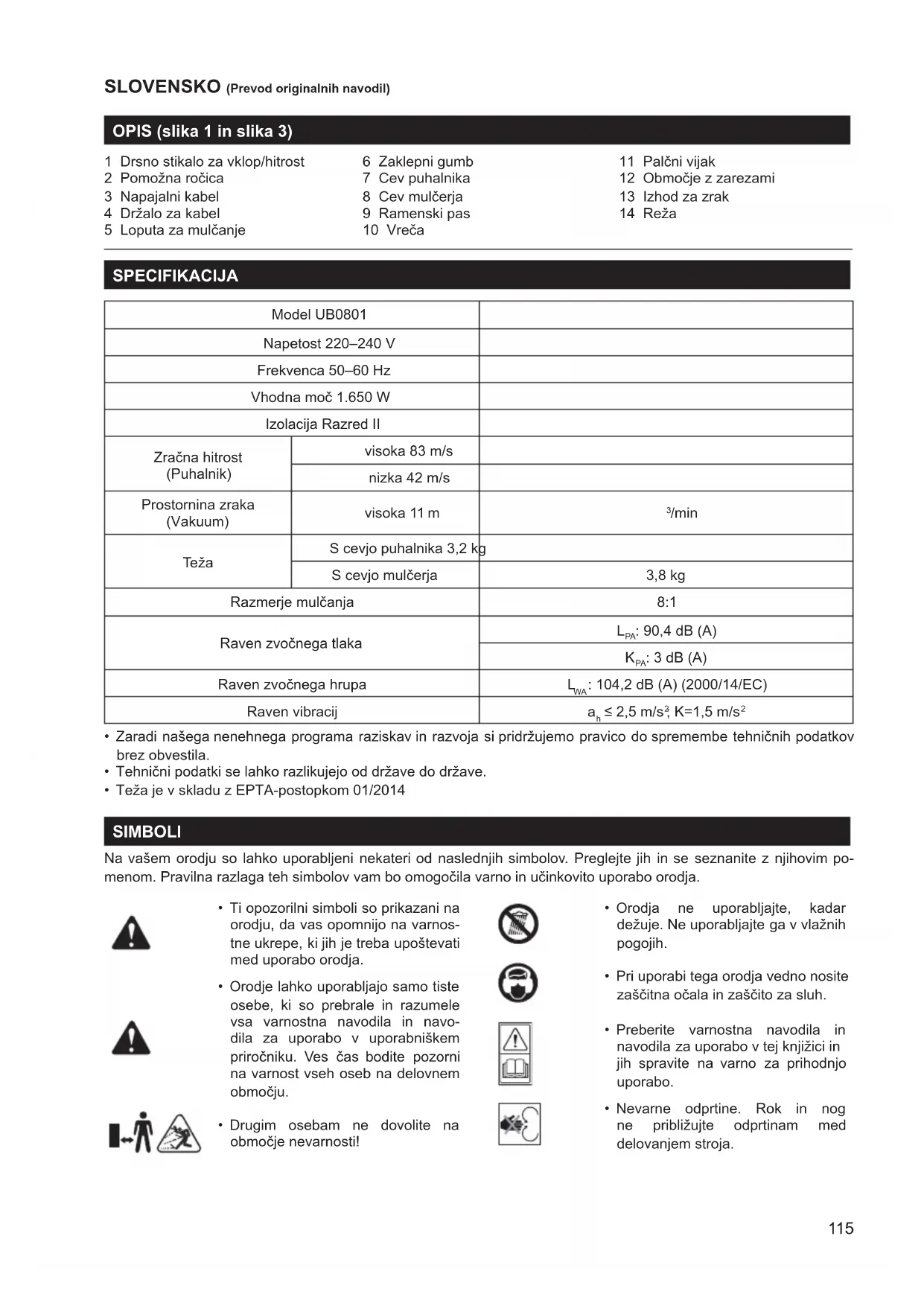 | Raven zvočnegа hrupa | LWA: 104,2 dB (A) (2000/14/EC) | |