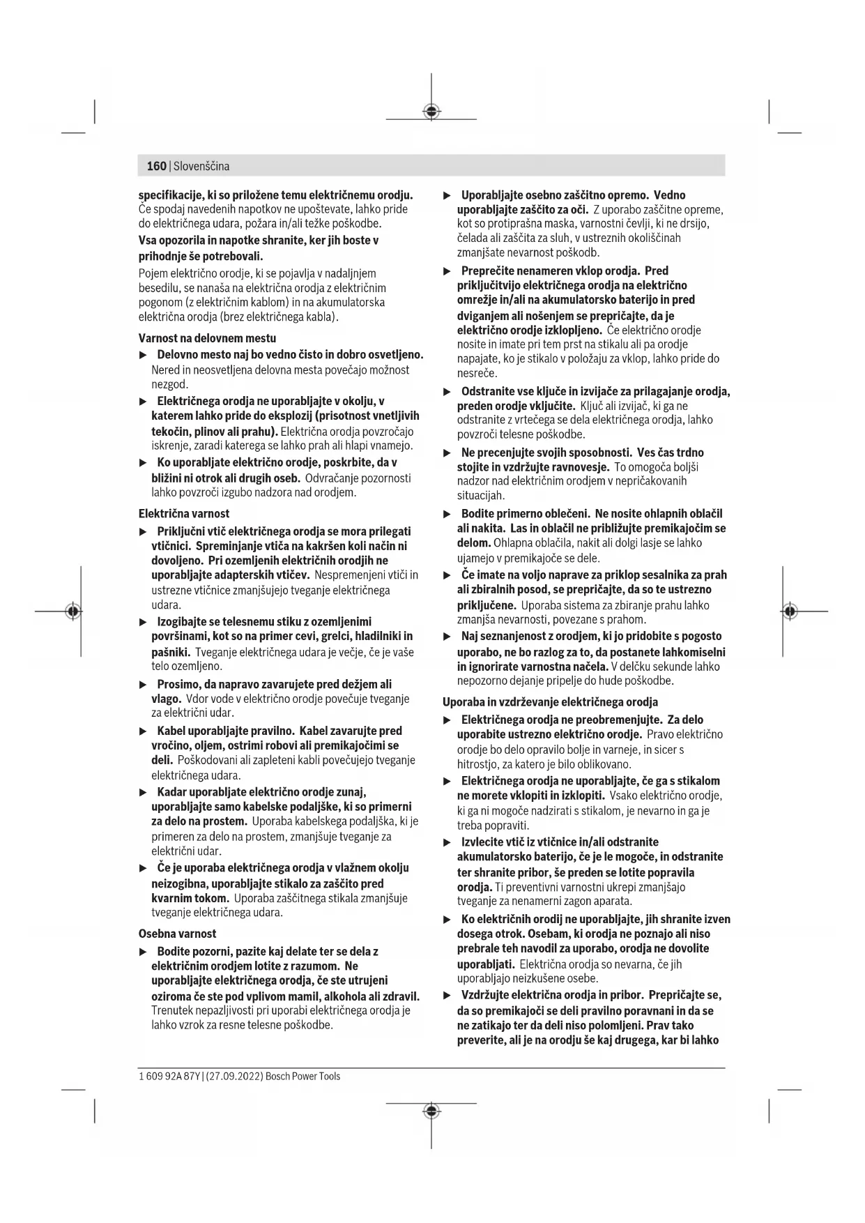 in med skladiščenjem °C –15…+50 Priporočene akumulatorske baterije GBA 18V… ProCORE18V… Priporočeni polnilniki GAL 18… GAX 18… GAL 36… A) brez obremenitve, pri najvišji stopnji na nastavitvenem kolescu, pri 20–25°C B) Odvisno od uporabljene akumulatorske baterije C) Omejena zmogljivost pri temperaturah pod 0°C. Podatki o hrupu/tresljajih Podatki o emisijah hrupa, pridobljeni v skladu s standardomEN62841-1. A-vrednotena raven zvočnega tlaka za električno orodje je tipično manjša od 70dB(A). Raven hrupa pri delu lahko preseže navedene vrednosti. Uporabite zaščito za sluh! Skupne vrednosti tresljajev a