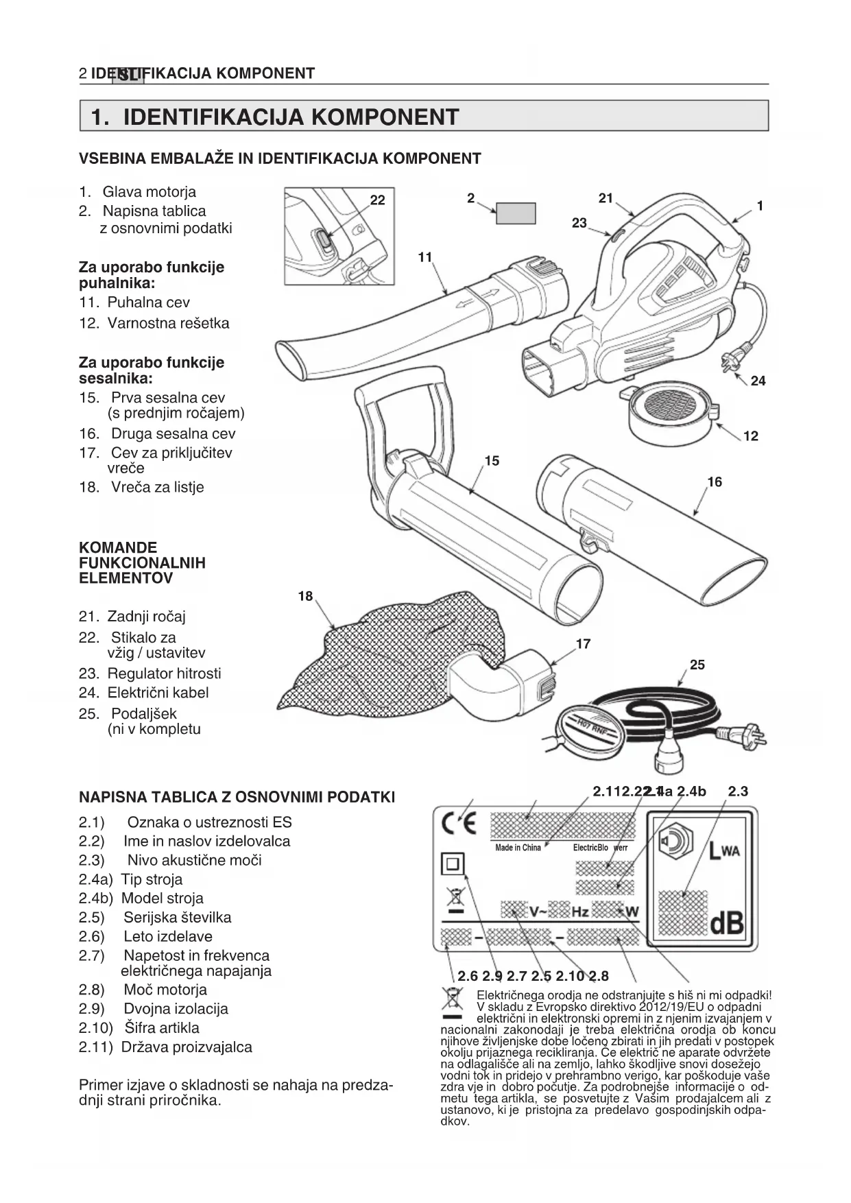 2.1) Oznaka o ustreznosti ES 2.2) Ime in naslov izdelovalca 2.3) Nivo akustične moči 2.4a) Tip stroja 2.4b) Model stroja 2.5) Serijska številka 2.6) Leto izdelave 2.7) Napetost in frekvenca električnega napajanja 2.8) Moč motorja 2.9) Dvojna izolacija 2.10) Šifra artikla 2.11) Država proizvajalca Primer izjave o skladnosti se nahaja na predza- dnji strani priročnika.