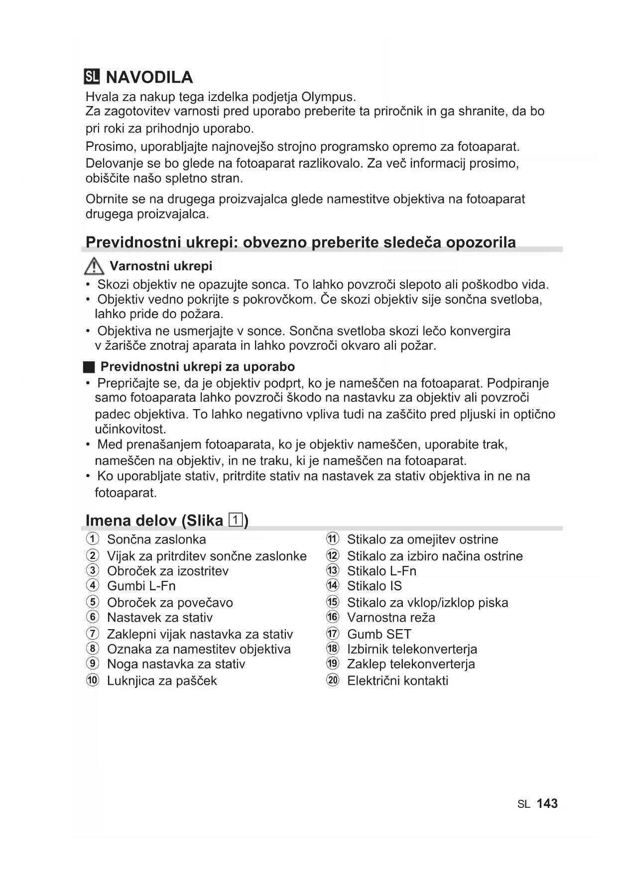 NAVODILA Hvala za nakup tega izdelka podjetja Olympus. Za zagotovitev varnosti pred uporabo preberite ta priročnik in ga shranite, da bo pri roki za prihodnjo uporabo. Prosimo, uporabljajte najnovejšo strojno programsko opremo za fotoaparat. Delovanje se bo glede na fotoaparat razlikovalo. Za več informacij prosimo, obiščite našo spletno stran. Obrnite se na drugega proizvajalca glede namestitve objektiva na fotoaparat drugega proizvajalca. Previdnostniukrepi:obveznopreberitesledečaopozorila Varnostni ukrepi