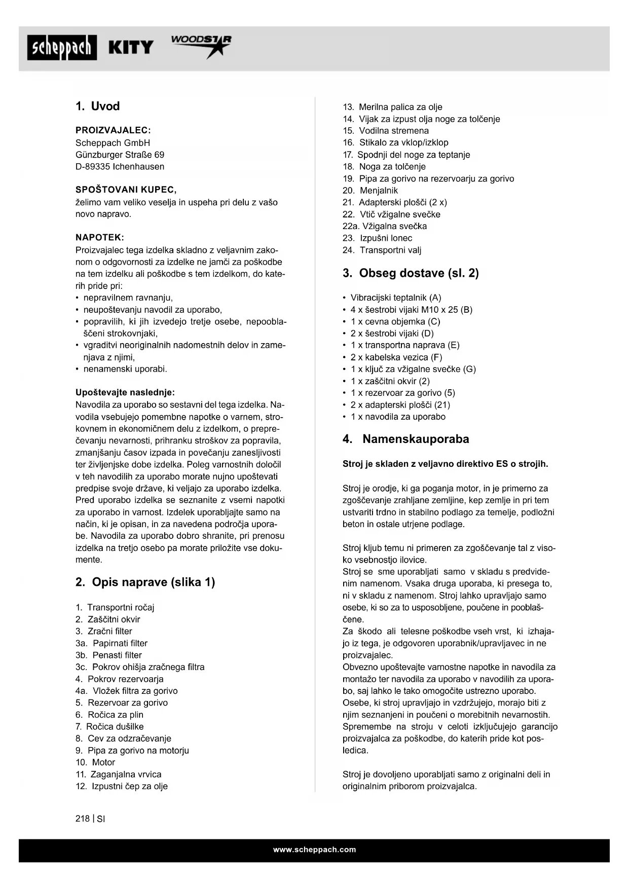 IZKLOP) Stikalo za vklop/izklop OPOZORILO! Signalna beseda za označevanje možne nevarne situacije, zaradi katere lahko pride do smrti ali hudih telesnih poškodb, če se ne prepreči. Izdelek ustreza veljavnim evropskim direktivam. PREVIDNO! Signalna beseda za označevanje možne nevarne situacije, zaradi katere lahko pride do majhnih ali zmernih poškodb, če se ne prepreči. Izdelek ustreza veljavnim srbskimi direktivam. NAPOTEK Signalna beseda za označevanje možne nevarne situacije, zaradi katere lahko pride do materialne škode na stroju ali lastnini, če se ne prepreči. V teh navodilih za uporabo smo mesta, ki zadevajo vašo varnost, označili s tem znakom.www.scheppach.com