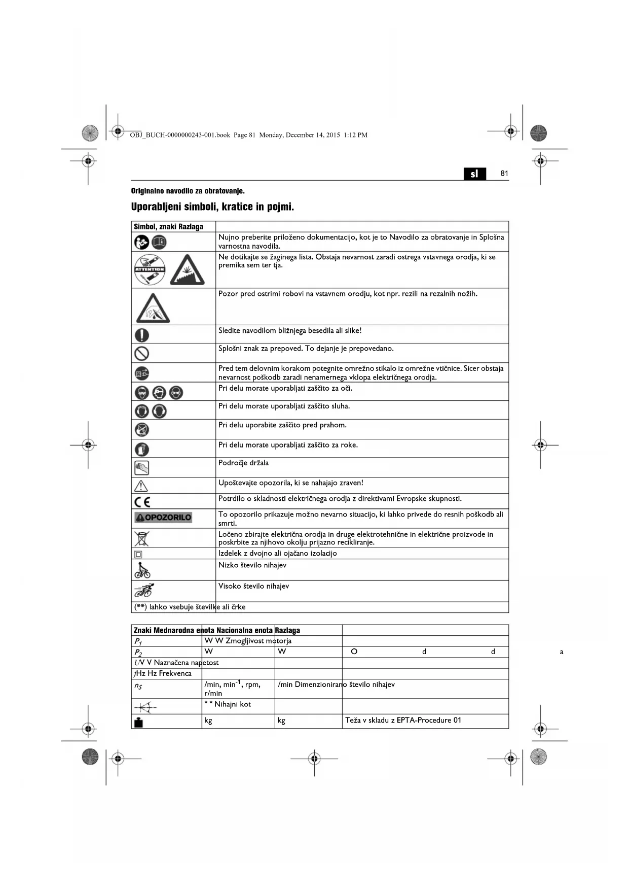 Originalno navodilo za obratovanje. Uporabljeni simboli, kratice in pojmi. Simbol, znaki Razlaga Nujno preberite priloženo dokumentacijo, kot je to Navodilo za obratovanje in Splošna varnostna navodila. Ne dotikajte se žaginega lista. Obstaja nevarnost zaradi ostrega vstavnega orodja, ki se premika sem ter tja. Pozor pred ostrimi robovi na vstavnem orodju, kot npr. rezili na rezalnih nožih. Sledite navodilom bližnjega besedila ali slike! Splošni znak za prepoved. To dejanje je prepovedano. Pred tem delovnim korakom potegnite omrežno stikalo iz omrežne vtičnice. Sicer obstaja nevarnost poškodb zaradi nenamernega vklopa električnega orodja. Pri delu morate uporabljati zaščito za oči. Pri delu morate uporabljati zaščito sluha. Pri delu uporabite zaščito pred prahom. Pri delu morate uporabljati zaščito za roke. Področje držala Upoštevajte opozorila, ki se nahajajo zraven! Potrdilo o skladnosti električnega orodja z direktivami Evropske skupnosti. To opozorilo prikazuje možno nevarno situacijo, ki lahko privede do resnih poškodb ali smrti. Ločeno zbirajte električna orodja in druge elektrotehnične in električne proizvode in poskrbite za njihovo okolju prijazno recikliranje. Izdelek z dvojno ali ojačano izolacijo Nizko število nihajev Visoko število nihajev (**) lahko vsebuje številke ali črke Znaki Mednarodna enota Nacionalna enota Razlaga