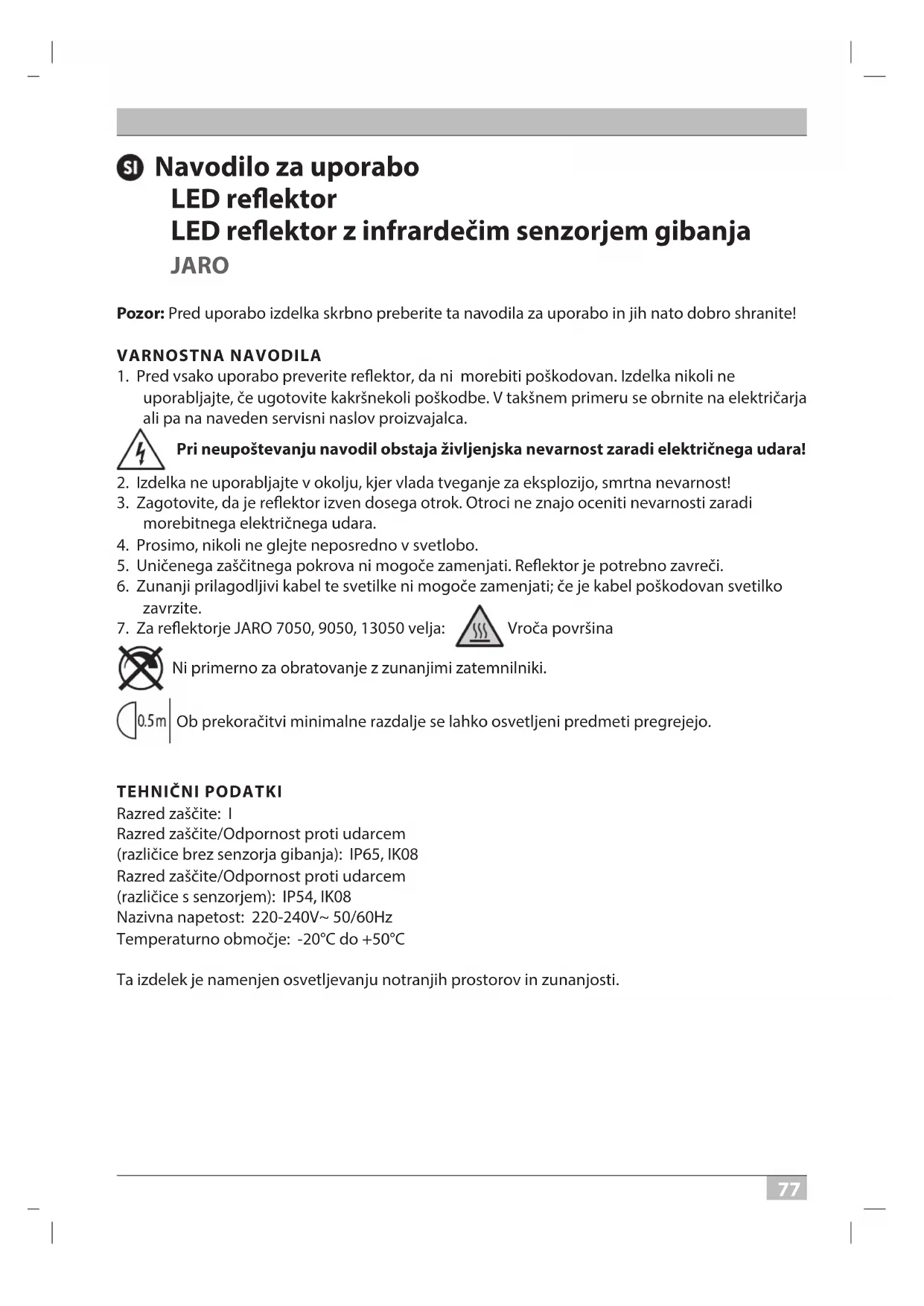 Razred zaščite: I Razred zaščite/Odpornost proti udarcem (različice brez senzorja gibanja): IP65, IK08 Razred zaščite/Odpornost proti udarcem (različice s senzorjem): IP54, IK08 Nazivna napetost: 220-240V~ 50/60Hz Temperaturno območje: -20°C do +50°C Ta izdelek je namenjen osvetljevanju notranjih prostorov in zunanjosti. 20P114 LED Strahler Jaro PIR 0533228 210327.indd 77 27.03.2021 16:10:547878 Navodilo za uporabo JARO MONTAŽA IN PRIKLJUČITEV NA ELEKTRIČNO NAPAJANJE 10 – 50 W Glejte slike od strani 4, 7 in 8