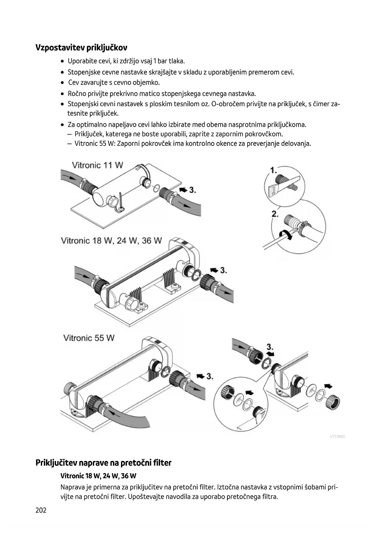 Priključitev naprave na pretočni filter Vitronic 18 W, 24 W, 36 W Naprava je primerna za priključitev na pretočni filter. Iztočna nastavka z vstopnimi šobami pri- vijte na pretočni filter. Upoštevajte navodila za uporabo pretočnega filtra.SL