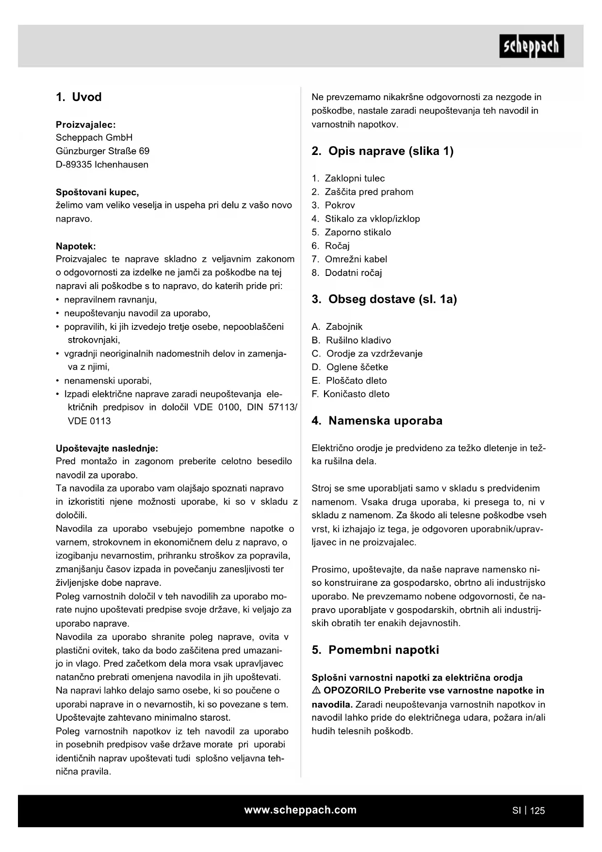 - Izpadi električne naprave zaradi neupoštevanja ele- ktričnih predpisov in določil VDE 0100, DIN 57113/ VDE 0113 Upoštevajte naslednje: Pred montažo in zagonom preberite celotno besedilo navodil za uporabo. Ta navodila za uporabo vam olajšajo spoznati napravo in izkoristiti njene možnosti uporabe, ki so v skladu z določili. Navodila za uporabo vsebujejo pomembne napotke o varnem, strokovnem in ekonomičnem delu z napravo, o izogibanju nevarnostim, prihranku stroškov za popravila, zmanjšanju časov izpada in povečanju zanesljivosti ter življenjske dobe naprave. Poleg varnostnih določil v teh navodilih za uporabo mo- rate nujno upoštevati predpise svoje države, ki veljajo za uporabo naprave. Navodila za uporabo shranite poleg naprave, ovita v plastični ovitek, tako da bodo zaščitena pred umazani- jo in vlago. Pred začetkom dela mora vsak upravljavec natančno prebrati omenjena navodila in jih upoštevati. Na napravi lahko delajo samo osebe, ki so poučene o uporabi naprave in o nevarnostih, ki so povezane s tem. Upoštevajte zahtevano minimalno starost. Poleg varnostnih napotkov iz teh navodil za uporabo in posebnih predpisov vaše države morate pri uporabi identičnih naprav upoštevati tudi splošno veljavna teh- nična pravila.www.scheppach.com
