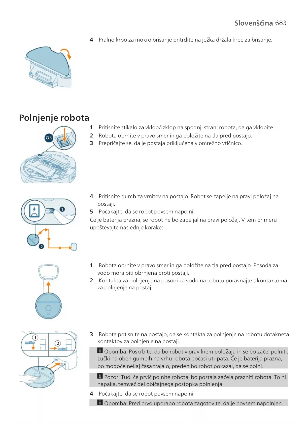 Zaščitite robota. Opomba: Robota ne približujte tekočinam in mokrim območjem, kot so pasje ali mačje sklede in pladnji za rože. Pomembno: navideznih sten ali prepovedanih območij ne uporabljajte za zaščito pred nevarnostjo. Pomembno: navidezne stene in prepovedana območja ne smejo preprečevati robotu, da bi se vrnil na postajo. Območje brez mokrega brisanja Ustvarite območja brez mokrega brisanja , da preprečite robotu, da bi mokro brisal talne obloge ali preproge. Opomba: Robot se bo izognil območjem brez mokrega brisanja, kadar je držalo krpe za brisanje nameščeno. Kadar držalo krpe za brisanje ni nameščeno na robota, bo robot območje brez mokrega brisanja posesal. Kako robot čisti V aplikaciji lahko izberete naslednje rutine čiščenja: Rutina Opis Redno Redno čiščenje je namenjeno za običajne dnevne rutine čiščenja. Robot očisti vsak prostor skladno z nastavitvami, ki ste jih določili in shranili v načrt čiščenja. Če robot ne prepozna okolja, ustvari zemljevid okolja in čisti v skladu z zadnjim nastavljenim načinom. Če je to način s funkcijo mokrega brisanja, vendar krpa ni nameščena, robot ne bo zagotovil vode. Ko robot konča čiščenje, se vrne na postajo. Prostor Območje - Prostor: robot očisti enega ali več prostorov po vrstnem redu, ki ga določite. - Območje: robot očisti območje v prostoru, ki ga določite. Ko izberete eno od zgornjih možnosti, lahko izberete način čiščenja in podrobno nastavite lastne nastavitve čiščenja in napredne nastavitve.689 Slovenščina Nastavitev lastnih nastavitev čiščenja, naprednih nastavitev in vrstnega reda čiščenja V aplikaciji lahko izberete pet različnih načinov čiščenja za vsak prostor. To so standardni načini, ki jih lahko uporabite v večini primerov. Način čiščenja lahko prilagodite tako, da podrobno nastavite lastne nastavitve čiščenja in napredne nastavitve. Načini čiščenja Način Opis Sesanje in mokro brisanje Robot hkrati sesa in izvaja mokro brisanje. Ta način je namenjen za redno čiščenje trdih tal. POMEMBNO: Za trda tla, ki so občutljiva na mokro brisanje, na primer parket, nastavite stopnjo vlažnosti v aplikaciji na najnižjo. Sesanje Robot samo posesa tla. Ta način lahko uporabljate za območja, ki niso primerna za mokro brisanje. Mokro brisanje Robot samo mokro pobriše tla. Tiho Robot čisti z minimalnim hrupom. Moč sesanja je znižana in glasovna opozorila so izklopljena. Intenzivno Robot hkrati sesa in izvaja mokro brisanje in pri polni moči. Ta način je namenjen za temeljito čiščenje malih območij. Upoštevajte, da v tem načinu ni priporočljivo čistiti večjih območij. Robot naredi pet prehodov območja, zato je čas čiščenja znatno daljši in poraba baterije se zelo poveča. Lastne nastavitve čiščenja Za vsak način čiščenja lahko podrobno prilagodite naslednje lastne nastavitve čiščenja: Nastavitev Opis Moč sesanja Spremenite moč sesanja: - nizka : za učinkovito čiščenje z majhno porabo energije in nizko stopnjo hrupa. - običajna : za redno čiščenje in učinkovito odstranjevanje finega prahu na trdih tleh z optimalnim ravnovesjem med močjo in učinkovitostjo. - močna : za temeljito čiščenje velikih talnih površin. Z enim polnjenjem lahko očisti več kot pri največji moči. - največja : idealno za odstranjevanje velikih delcev umazanije, na primer drobtin. Velika moč sesanja odstrani fine prašne delce, skrite globoko v preprogah in špranjah.690 Slovenščina Nastavitev Opis Stopnja vlažnosti Določite pretok vode, ki se črpa iz električne posode za vodo na krpo za mokrobrisanje: POMEMBNO: V posodo za vodo ne vlivajte vroče vode ali čistilnih sredstev. - Nizka: za mokro brisanje občutljivih tal, npr. parketa. Kombinacija sesanja inmokrega brisanja odstrani več finega prahu kot samo sesanje.- Srednja: optimalno za redno mokro in suho čiščenje. Krpa za mokro brisanjeodstrani površinsko umazanijo in bakterije, da bo vaš dom higienično čist inzdrav.- Visoka: za brezhibno čist dom. Priporočamo, da to nastavitev kombinirate zdvema ali petimi ponovitvami poti čiščenja, da bo čiščenje intenzivno.Ponovitev potičiščenja Določite število ponovitev. En prehod je dovolj za običajno čiščenje. Robota jemogoče programirati tako, da pri čiščenju naredi dva ali pet prehodov za intenzivnočiščenje. Priporočamo, da to možnost izberete samo za določena območja čiščenja,ker vpliva na trajanje čiščenja. Napredne nastavitve V aplikaciji lahko nastavite svoj vrstni red čiščenja tako, da kliknete ikono zanastavitve v zgornjem desnem kotu in izberete »Vrstni red čiščenja«. Uporaba sesalnika Priprava na posamezno čiščenje Preden pošljete robota na čiščenje:1 Stransko ščetko namestite tako, da se zaskoči v pravilni položaj na spodnjistrani robota.2 Držalo krpe za brisanje pritrdite na spodnji del posode za vodo.691 Slovenščina