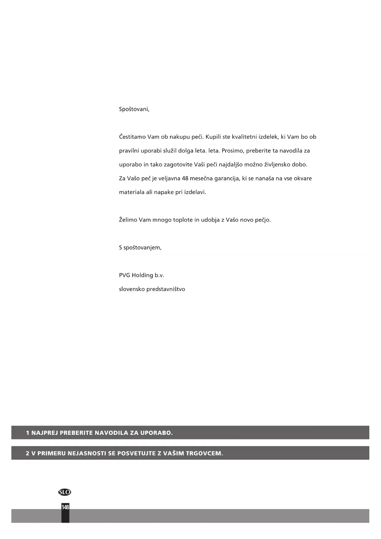 147Spoštovani, Čestitamo Vam ob nakupu peči. Kupili ste kvalitetni izdelek, ki Vam bo ob pravilni uporabi služil dolga leta. leta. Prosimo, preberite ta navodila za uporabo in tako zagotovite Vaši peči najdaljšo možno življensko dobo. Za Vašo peč je veljavna 48 mesečna garancija, ki se nanaša na vse okvare materiala ali napake pri izdelavi. Želimo Vam mnogo toplote in udobja z Vašo novo pečjo. S spoštovanjem, PVG Holding b.v. slovensko predstavništvo 1 NAJPREJ PREBERITE NAVODILA ZA UPORABO. 2 V PRIMERU NEJASNOSTI SE POSVETUJTE Z VAŠIM TRGOVCEM.