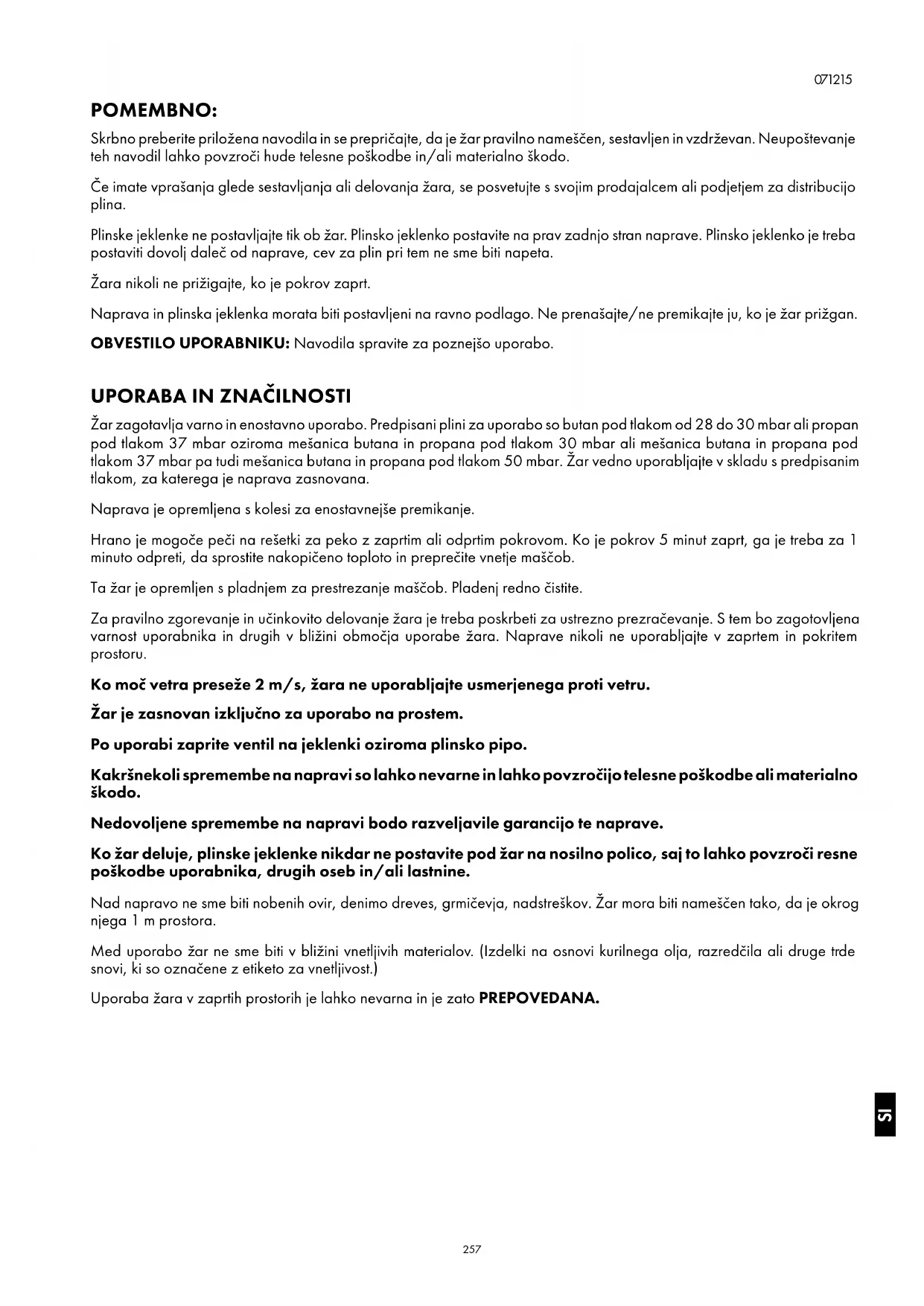 Žar zagotavlja varno in enostavno uporabo. Predpisani plini za uporabo so butan pod tlakom od 28 do 30 mbar ali propan pod tlakom 37 mbar oziroma mešanica butana in propana pod tlakom 30 mbar ali mešanica butana in propana pod tlakom 37 mbar pa tudi mešanica butana in propana pod tlakom 50 mbar. Žar vedno uporabljajte v skladu s predpisanim tlakom, za katerega je naprava zasnovana. Naprava je opremljena s kolesi za enostavnejše premikanje. Hrano je mogoče peči na rešetki za peko z zaprtim ali odprtim pokrovom. Ko je pokrov 5 minut zaprt, ga je treba za 1 minuto odpreti, da sprostite nakopičeno toploto in preprečite vnetje maščob. Ta žar je opremljen s pladnjem za prestrezanje maščob. Pladenj redno čistite. Za pravilno zgorevanje in učinkovito delovanje žara je treba poskrbeti za ustrezno prezračevanje. S tem bo zagotovljena varnost uporabnika in drugih v bližini območja uporabe žara. Naprave nikoli ne uporabljajte v zaprtem in pokritem prostoru. Ko moč vetra preseže 2 m/s, žara ne uporabljajte usmerjenega proti vetru. Žar je zasnovan izključno za uporabo na prostem. Po uporabi zaprite ventil na jeklenki oziroma plinsko pipo. Kakršnekoli spremembe na napravi so lahko nevarne in lahko povzročijo telesne poškodbe ali materialno škodo. Nedovoljene spremembe na napravi bodo razveljavile garancijo te naprave. Ko žar deluje, plinske jeklenke nikdar ne postavite pod žar na nosilno polico, saj to lahko povzroči resne poškodbe uporabnika, drugih oseb in/ali lastnine. Nad napravo ne sme biti nobenih ovir, denimo dreves, grmičevja, nadstreškov. Žar mora biti nameščen tako, da je okrog njega 1 m prostora. Med uporabo žar ne sme biti v bližini vnetljivih materialov. (Izdelki na osnovi kurilnega olja, razredčila ali druge trde snovi, ki so označene z etiketo za vnetljivost.) Uporaba žara v zaprtih prostorih je lahko nevarna in je zato PREPOVEDANA. SI258