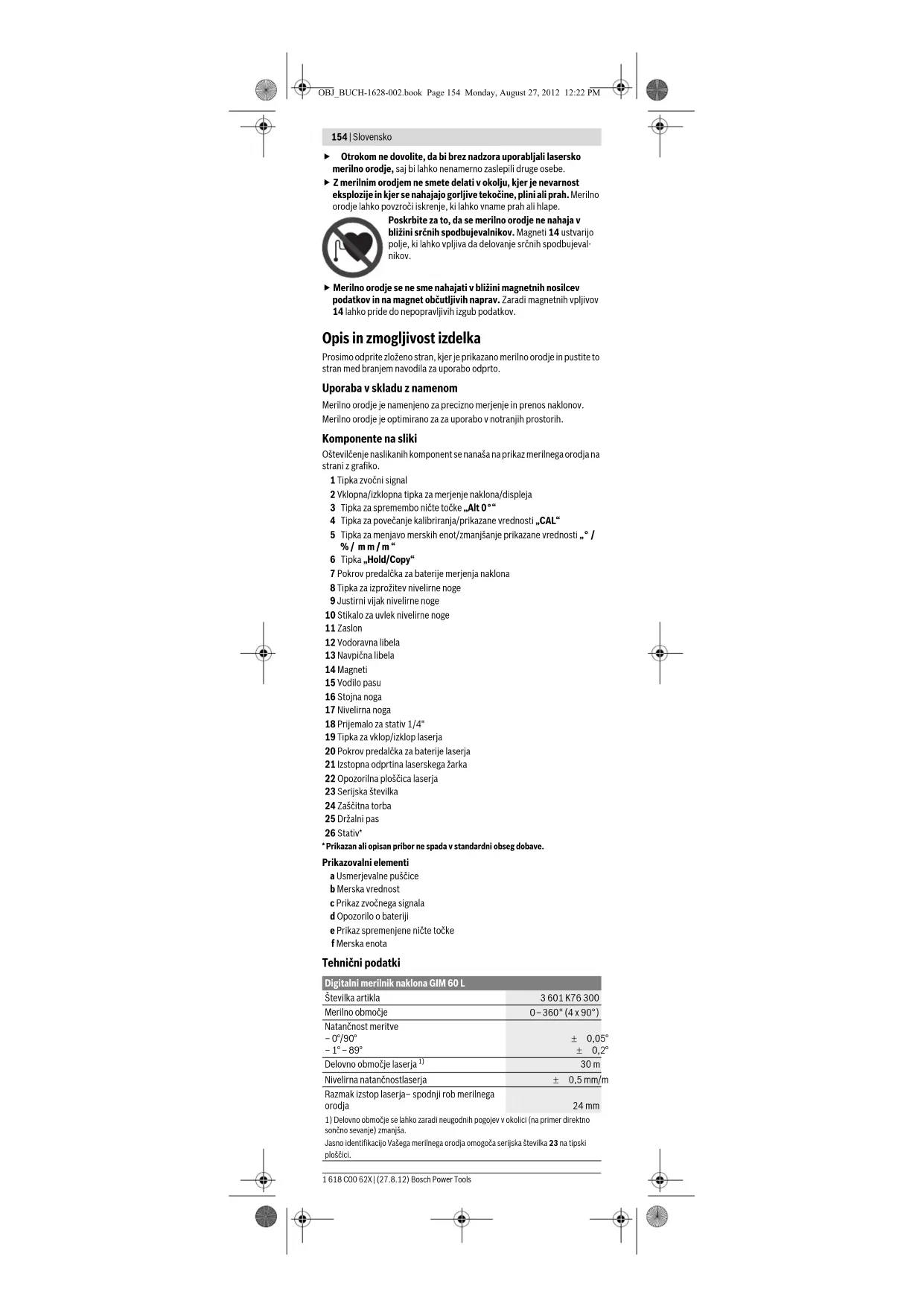 sončno sevanje) zmanjša. Jasno identifikacijo Vašega merilnega orodja omogoča serijska številka 23 na tipski ploščici. OBJ_BUCH-1628-002.book Page 155 Monday, August 27, 2012 12:22 PM156 | Slovensko 1 618 C00 62X | (27.8.12) Bosch Power Tools f Preprečite močne sunke v merilno orodje ali padce na tla. Po močnih zunanjih vplivih na merilno orodje morate pred nadaljevanjem dela vedno izvesti pregled natančnosti (glejte „Preizkus natančnosti in kalibriranje merilnega orodja“, stran 158). f Poskrbite za to, da bodo naležne površine merilnega orodja čiste in jih zavarujte pred sunki in udarci. Nečisti delci ali deformacije lahko privedejo do tega, da so meritve nepravilne. Postavitev/pritrditev merilnega orodja Za merjenje ali prenos naklonov merilnega orodja ni potrebno postaviti ali položiti le na površine, ampak imate še druge možnosti, da ga postavite oz. pritrdite. Postavitev z nivelirno mehaniko (npr. pri neravnih tleh) (glejte sliko B): – Za kratek čas pritisnite proti stojni nogi 16 in jo s tem izprožite. Pritisnite tipko 8 za sprožitev nivelirne noge 17. Justirajte nivelirno nogo z zasukom justirnega vijaka 9 v višino tako, da bo potekal laserski žarek vzdolž povr- šine, ki jo želite izmeriti oz. se željen naklon prikaže kot merska vrednost b. – Če želite delati brez nivelirne mehanike, morate stojno nogo 16 in nivelirno nogo 17 ponovno potisniti nazaj noter. V ta namen najprej pritisnite oba dela stojne noge skupaj () in nato potisnite stojno nogo 16 v merilno orodje () tako, da slišno zaskoči. Za vrnitev nivelirne noge 17 potisnite stikalo 10 na stran. Pritrditev na stativ: – Postavite merilno orodje s 1/4"-prijemalom stativa 18 na menjalno ploščo stativa 26 ali na običajni komercialni fotostativ. Privijte merilno orodje z nastavitvenim vijakom na menjalno ploščo. Pritrditev z magneti: – Namestite merilno orodje z magneti 14 na zadostno magnetiziran del. f Preverite merilno orodje, ali je varno pritrjeno. Merilna orodja, ki niso varno pritrjena, lahko padejo dol in vas ali druge osebe pri tem poškodujejo. Če merilno orodje pade navzdol, se lahko poškoduje ali povzroči škodo. Pritrditev z držalnima pasovoma (glejte sliko C): – Potegnite držalna pasova 25 skozi vodila pasu 15 in pritrdite merilno orodje z obema pasovoma na cevi ali podobno. Pazite na to, da se sprijemalna pritrditev na koncu pasu pritisne na držalni pas. Pri tankih ceveh zaradi tega vtaknite držalni pas z gladko stranjo obrnjeno navzven skozi vodili in ga ovijte, kot je prikazano na sliki, še enkrat skozi merilno orodje. Pri debelih ceveh pa vtaknite držalni pas z gladko stranjo obrnjeno navznoter skozi vodili pasu. f Zavarujte merilno orodje vselej z obema držalnima pasovoma in preverite držalne pasove na trdnost naseda. Držalna moč pasov 25 zavisi od sestave materiala, na katerega se pritrdijo. Ohlapno nasedla merilna orodja lahko zdrsijo dol in se poškodujejo ali pa povzročijo poškodbe. f Ne dovolite, da bi otroci brez nadzora uporabljali držalna pasova 25. Lahko se zgodi, da se z držalnima pasovoma poškodujejo. Vklop/izklop merjenja naklona in displeja Za vklop merjenja naklona in displeja pritisnite vklopno/izklopno tipko 2. Merilno orodje se nahaja v funkciji merjenja naklona s standardno ničto točko. Za izklop merjenja naklona in displeja ponovno pritisnite vklopno/izklopno tipko 2. Če pribl. 30 min ne pritisnite nobene tipke na merilnem orodju in se naklon merilnega orodja ne spremeni za več kot 1,5° se merilno orodje avtomatsko izklopi, ker s tem varuje baterije. Laserja to ne zadeva. Vklop/izklop laserja Za vklop laserja pritisnite vklopno/izklopno tipko 19 v položaj „I“. f Laserskega žarka ne usmerjajte na osebe ali živali in ne glejte vanj, tudi ne iz večje razdalje. Za izklop laserja pritisnite vklopno/izklopno tipko 19 v položaj „0“. f Merilnega orodja z vklopljenim laserjem ne smete pustiti brez nadzora in izklopite laser po uporabi. Laserski žarek bi druge osebe lahko zaslepil. Ko laserja ne uporabljate, ga izklopite, da bi tako privarčevali z energijo. Spreminjanje merske enote (glejte sliko A) Lahko kadarkoli menjate med merskimi enotami „°“, „%“ in „mm/m“. V ta namen pritisnite tipko za menjavo merskih enot 5 toliko krat, da se bo željena merska enota pojavila na prikazovalniku f. Aktualna merska vrednost se avtomatsko preračuna. Pri izklopu in vklopu merilne naprave se nastavitev merske enote ohrani. OBJ_BUCH-1628-002.book Page 156 Monday, August 27, 2012 12:22 PMSlovensko | 157 Bosch Power Tools 1 618 C00 62X | (27.8.12) Vklop/izklop zvočnega signala S tipko zvočni signal 1 lahko zvočni signal vklopite ali izklopite. Pri vklopljenem zvočnem signalu se pojavi na displeju prikaz c. Pri izklapljanju in vklapljanju merilnega orodja ostane nastavitev zvočnega signala ohranjena. Prikazi merskih vrednosti in pripomočki za usmerjevanje Z vsakim premikanjem merilnika naklona se izmerjena vrednost aktualizira. Pri večjih premikanjih naprave počakajte z odčitavanjem, dokler se izmerjena vrednost nič več ne spreminja. Glede na položaj merilnika naklona sta prikaza izmerjene vrednosti in merske enote na zaslonu obrnjena za 180°. Na ta način je odčitavanje prikaza zagotovljeno tudi pri delu nad glavo. Mersko orodje prikazuje s pripomočki za usmerjevanje a na displeju, v katero smer se mora nagniti, da bi se dosegla ciljna vrednost. Ciljna vrednost je pri standardnih vrednostih vodoravnica oz. navpičnica, v funkciji „Copy“ shra- njena merska vrednost in pri spremenjeni ničti točki shranjena ničta točka. Ko je ciljna vrednost dosežena, se izbrišejo usmerjevalne puščice za naravnavanje a in pri vklopljenem zvočnem signalu zaslišite trajajoč ton. Merilne funkcije Ohranitev/prenos merske vrednosti (glejte sliko D) S tipko „Hold/Copy“ 6 lahko krmilite dve funkciji: – Zadržanje („Hold“) merske vrednosti, tudi če se merilno orodje naknadno premakne (npr. ker je meriln
