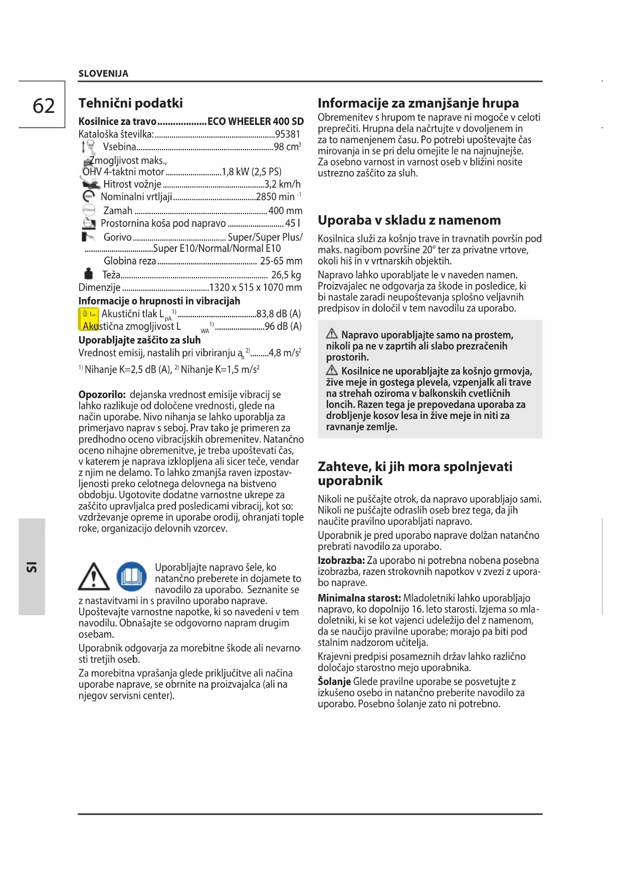 doletniki, ki se kot vajenci udeležijo del z namenom, da se naučijo pravilne uporabe; morajo pa biti pod stalnim nadzorom učitelja. Krajevni predpisi posameznih držav lahko različno določajo starostno mejo uporabnika. Šolanje Glede pravilne uporabe se posvetujte z izkušeno osebo in natančno preberite navodilo za uporabo. Posebno šolanje zato ni potrebno. Tehnični podatki Kosilnice za travo ................... ECO WHEELER 400 SD Kataloška številka: ..........................................................95381 Vsebina ..................................................................98 cm