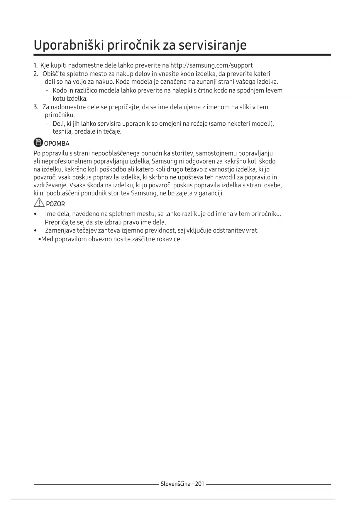 priročniku. ‐ Deli, ki jih lahko servisira uporabnik so omejeni na ročaje (samo nekateri modeli), tesnila, predale in tečaje. OPOMBA Po popravilu s strani nepooblaščenega ponudnika storitev, samostojnemu popravljanju ali neprofesionalnem popravljanju izdelka, Samsung ni odgovoren za kakršno koli škodo na izdelku, kakršno koli poškodbo ali katero koli drugo težavo z varnostjo izdelka, ki jo povzroči vsak poskus popravila izdelka, ki skrbno ne upošteva teh navodil za popravilo in vzdrževanje. Vsaka škoda na izdelku, ki jo povzroči poskus popravila izdelka s strani osebe, kini pooblaščeni ponudnik storitev Samsung, ne bo zajeta v garanciji. POZOR
