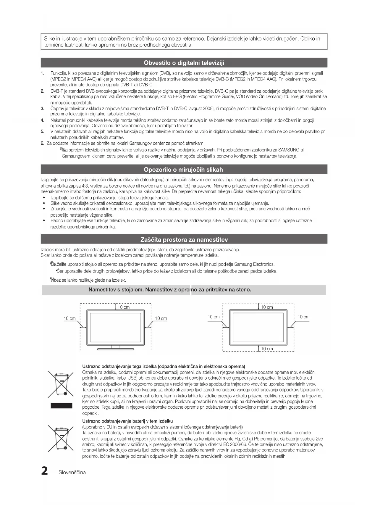 VCR 8 Vídeos 36 Visual. Básica 39 Volume 5 Volume Auto. 19 BN68-02840A-00L06-Book.indb 60 2010-03-05 오후 8:26:43This page is intentionally left blank. BN68-02840A-00L06-Book.indb 61 2010-03-05 오후 8:26:432 Slovenščina Slike in ilustracije v tem uporabniškem priročniku so samo za referenco. Dejanski izdelek je lahko videti drugačen. Obliko in tehnične lastnosti lahko spremenimo brez predhodnega obvestila. Obvestilo o digitalni televiziji 1. Funkcije, ki so povezane z digitalnim televizijskim signalom (DVB), so na voljo samo v državah/na območjih, kjer se oddajajo digitalni prizemni signali (MPEG2 in MPEG4 AVC) ali kjer je mogoč dostop do združljive storitve kabelske televizije DVB-C (MPEG2 in MPEG4 AAC). Pri lokalnem trgovcu preverite, ali imate dostop do signala DVB-T ali DVB-C. 2. DVB-T je standard DVB evropskega konzorcija za oddajanje digitalne prizemne televizije, DVB-C pa je standard za oddajanje digitalne televizije prek kabla. V tej specifikaciji pa niso vključene nekatere funkcije, kot so EPG (Electric Programme Guide), VOD (Video On Demand) itd. Torej jih zaenkrat še ni mogoče uporabljati. 3. Čeprav je televizor v skladu z najnovejšima standardoma DVB-T in DVB-C [avgust 2008], ni mogoče jamčiti združljivosti s prihodnjimi sistemi digitalne prizemne televizije in digitalne kabelske televizije. 4. Nekateri ponudniki kabelske televizije morda takšno storitev dodatno zaračunavajo in se boste zato morda morali strinjati z določbami in pogoji njihovega poslovanja. Odvisno od države/območja, kjer uporabljate televizor. 5. V nekaterih državah ali regijah nekatere funkcije digitalne televizije morda niso na voljo in digitalna kabelska televizija morda ne bo delovala pravilno pri nekaterih ponudnikih kabelskih storitev.