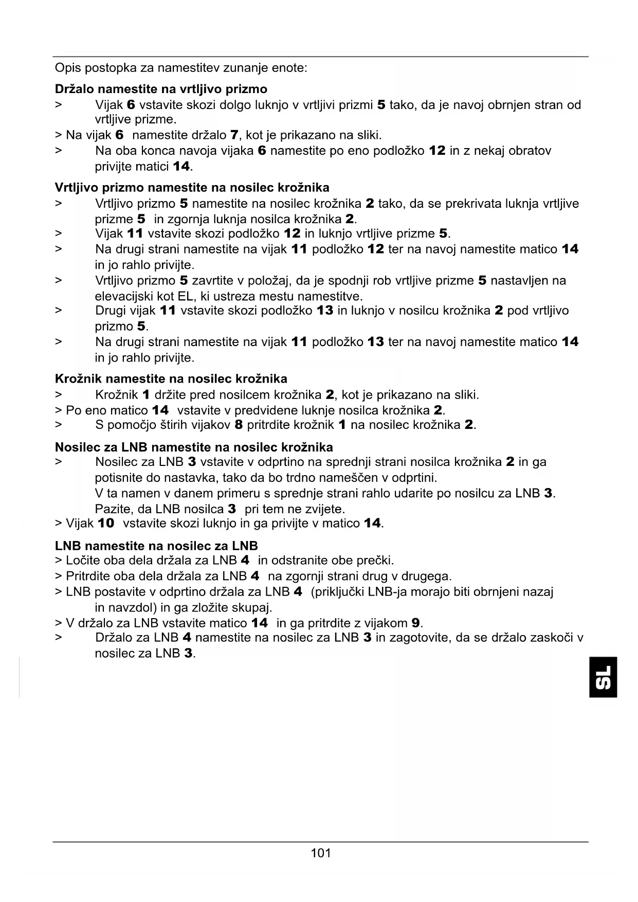 6 11/12/14 2 10 3 9/1412 5 14 11/13/14 Št. Kos Izdelek 1 1 Krožnik 2 1 Nosilec krožnika 3 1 Nosilec za LNB 4 1 Držalo za LNB 5 1 Vrtljiva prizma 6 1 U-vijak 7 1 Držalo 8 4 Vijak s križno zarezo M6 x 12 9 1 Imbus vijak M6 x 16 10 1 Imbus vijak M6 x 35 11 2 Šestrobi vijak M6x65 12 4 Podložka M6 x 12 13 2 Podložka M6 x 17 14 10 Šestroba matica M6 1 Navodila za namestitev 100Opis postopka za namestitev zunanje enote: Držalo namestite na vrtljivo prizmo > Vijak 6 vstavite skozi dolgo luknjo v vrtljivi prizmi 5 tako, da je navoj obrnjen stran od vrtljive prizme. > Na vijak 6 namestite držalo 7, kot je prikazano na sliki. > Na oba konca navoja vijaka 6 namestite po eno podložko 12 in z nekaj obratov privijte matici 14. Vrtljivo prizmo namestite na nosilec krožnika > Vrtljivo prizmo 5 namestite na nosilec krožnika 2 tako, da se prekrivata luknja vrtljive prizme 5 in zgornja luknja nosilca krožnika 2. > Vijak 11 vstavite skozi podložko 12 in luknjo vrtljive prizme 5. > Na drugi strani namestite na vijak 11 podložko 12 ter na navoj namestite matico 14 in jo rahlo privijte. > Vrtljivo prizmo 5 zavrtite v položaj, da je spodnji rob vrtljive prizme 5 nastavljen na elevacijski kot EL, ki ustreza mestu namestitve. > Drugi vijak 11 vstavite skozi podložko 13 in luknjo v nosilcu krožnika 2 pod vrtljivo prizmo 5. > Na drugi strani namestite na vijak 11 podložko 13 ter na navoj namestite matico 14 in jo rahlo privijte. Krožnik namestite na nosilec krožnika > Krožnik 1 držite pred nosilcem krožnika 2, kot je prikazano na sliki. > Po eno matico 14 vstavite v predvidene luknje nosilca krožnika 2. > S pomočjo štirih vijakov 8 pritrdite krožnik 1 na nosilec krožnika 2. Nosilec za LNB namestite na nosilec krožnika > Nosilec za LNB 3 vstavite v odprtino na sprednji strani nosilca krožnika 2 in ga potisnite do nastavka, tako da bo trdno nameščen v odprtini. V ta namen v danem primeru s sprednje strani rahlo udarite po nosilcu za LNB 3. Pazite, da LNB nosilca 3 pri tem ne zvijete. > Vijak 10 vstavite skozi luknjo in ga privijte v matico 14. LNB namestite na nosilec za LNB > Ločite oba dela držala za LNB 4 in odstranite obe prečki. > Pritrdite oba dela držala za LNB 4 na zgornji strani drug v drugega. > LNB postavite v odprtino držala za LNB 4 (priključki LNB-ja morajo biti obrnjeni nazaj in navzdol) in ga zložite skupaj. > V držalo za LNB vstavite matico 14 in ga pritrdite z vijakom 9. > Držalo za LNB 4 namestite na nosilec za LNB 3 in zagotovite, da se držalo zaskoči v nosilec za LNB 3.