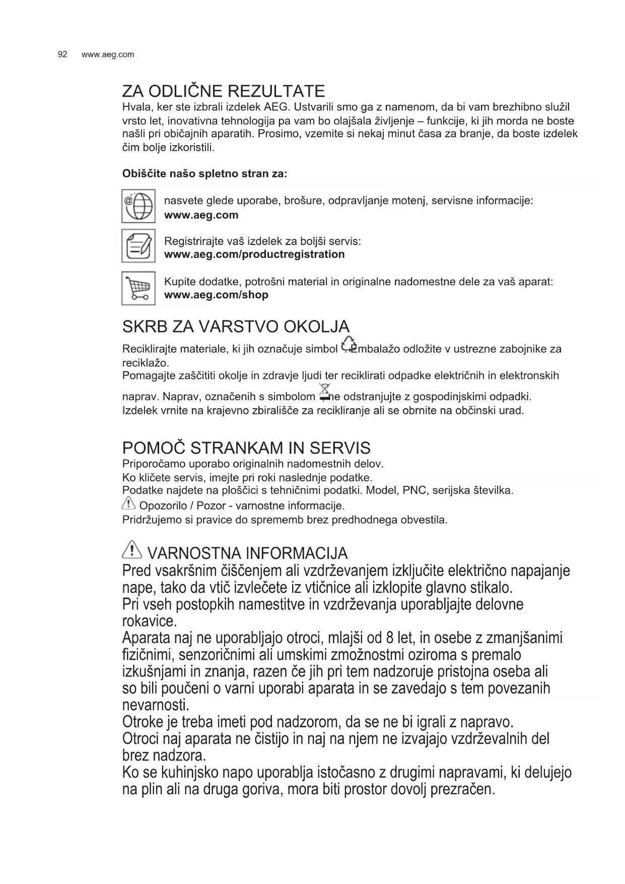 Priporočamo uporabo originalnih nadomestnih delov. Ko kličete servis, imejte pri roki naslednje podatke. Podatke najdete na ploščici s tehničnimi podatki. Model, PNC, serijska številka. Opozorilo / Pozor - varnostne informacije. Pridržujemo si pravice do sprememb brez predhodnega obvestila. VARNOSTNA INFORMACIJA Pred vsakršnim čiščenjem ali vzdrževanjem izključite električno napajanje nape, tako da vtič izvlečete iz vtičnice ali izklopite glavno stikalo. Pri vseh postopkih namestitve in vzdrževanja uporabljajte delovne rokavice. Aparata naj ne uporabljajo otroci, mlajši od 8 let, in osebe z zmanjšanimi zičnimi, senzoričnimi ali umskimi zmožnostmi oziroma s premalo izkušnjami in znanja, razen če jih pri tem nadzoruje pristojna oseba ali so bili poučeni o varni uporabi aparata in se zavedajo s tem povezanih nevarnosti. Otroke je treba imeti pod nadzorom, da se ne bi igrali z napravo. Otroci naj aparata ne čistijo in naj na njem ne izvajajo vzdrževalnih del brez nadzora. Ko se kuhinjsko napo uporablja istočasno z drugimi napravami, ki delujejo na plin ali na druga goriva, mora biti prostor dovolj prezračen.