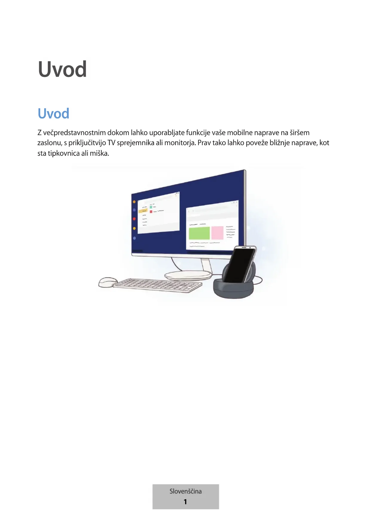 Uvod Uvod Z večpredstavnostnim dokom lahko uporabljate funkcije vaše mobilne naprave na širšem zaslonu, s priključitvijo TV sprejemnika ali monitorja. Prav tako lahko poveže bližnje naprave, kot sta tipkovnica ali miška. Slovenščina 1Uvod