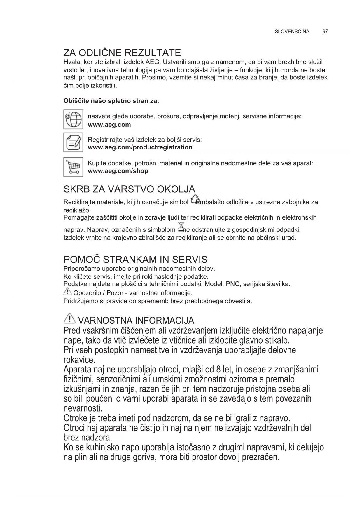 Priporočamo uporabo originalnih nadomestnih delov. Ko kličete servis, imejte pri roki naslednje podatke. Podatke najdete na ploščici s tehničnimi podatki. Model, PNC, serijska številka. Opozorilo / Pozor - varnostne informacije. Pridržujemo si pravice do sprememb brez predhodnega obvestila. VARNOSTNA INFORMACIJA Pred vsakršnim čiščenjem ali vzdrževanjem izključite električno napajanje nape, tako da vtič izvlečete iz vtičnice ali izklopite glavno stikalo. Pri vseh postopkih namestitve in vzdrževanja uporabljajte delovne rokavice. Aparata naj ne uporabljajo otroci, mlajši od 8 let, in osebe z zmanjšanimi zičnimi, senzoričnimi ali umskimi zmožnostmi oziroma s premalo izkušnjami in znanja, razen če jih pri tem nadzoruje pristojna oseba ali so bili poučeni o varni uporabi aparata in se zavedajo s tem povezanih nevarnosti. Otroke je treba imeti pod nadzorom, da se ne bi igrali z napravo. Otroci naj aparata ne čistijo in naj na njem ne izvajajo vzdrževalnih del brez nadzora. Ko se kuhinjsko napo uporablja istočasno z drugimi napravami, ki delujejo na plin ali na druga goriva, mora biti prostor dovolj prezračen. SL NAVODILO ZA UPORABOwww.aeg.com