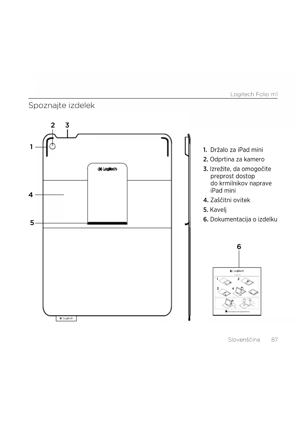 iPad mini v drugo držalo: Uporaba naprave iPad mini Ko odprete etui, naprava iPad mini preklopi iz stanja spanja: Ko zaprete etui, naprava iPad mini preklopi v stanje spanja.Logitech Folio m1 Slovenščina 89 Dva zorna kota Etui Folio omogoča dva zorna kota – enega za ogled večpredstavnostnih vsebin in drugega za brskanje. Pri predvajanju večpredstavnostnih vsebin lahko nastavite poljuben naklon naprave iPad mini: Če želite brskati, zložite etui Folio v smeri nazaj vzdolž hrbtnega roba: Odstranjevanje naprave iPad mini Če želite odstraniti iPad mini iz etuija Folio, upognite enega od vogalnih držal naprave iPad mini v smeri nazaj: Tako sprostite iPad mini:Logitech Folio m1 90 Slovenščina Obiščite Središče za izdelke V spletu so na voljo dodatne informacije in pomoč za vaš izdelek. Vzemite si trenutek za obisk Središča za izdelke in pridobite več informacij o svojem novem etuiju Folio. www.logitech.com/support/folio-m1 V spletnih člankih lahko najdete pomoč za nastavitve, nasvete za uporabo in informacije o dodatnih funkcijah. Če potrebujete nasvet, imate vprašanja ali želite deliti svoje rešitve z drugimi, se povežite s skupnostjo uporabnikov na našem forumu. Iščite po široki paleti vsebine, ki vključuje: