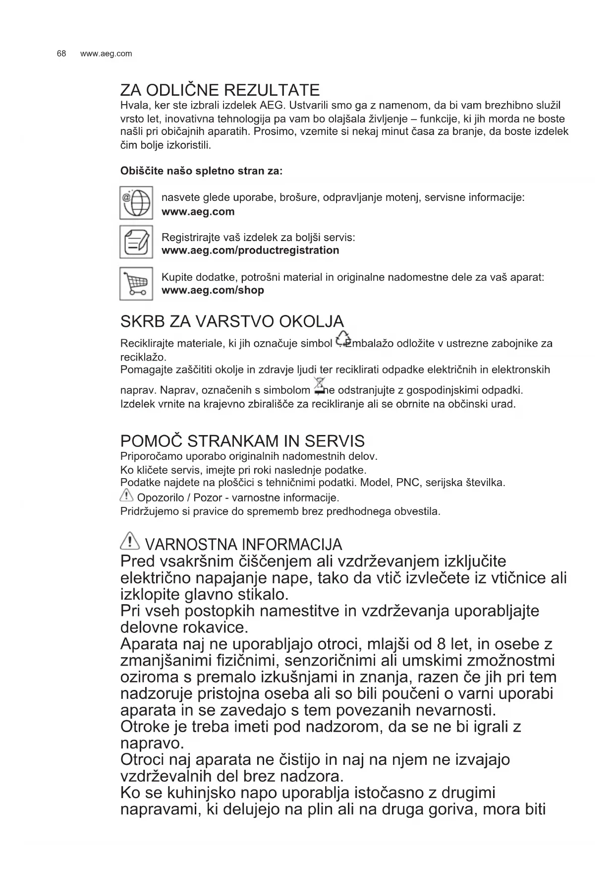 VARNOSTNA NAVODILA Odprti ogenj je škodljiv za fi ltre in lahko povzroči požar, zato je uporaba slednjega v vsakem primeru prepovedana. Cvrtje zahteva stalen nadzor, da se pregreto olje ne bi vnelo. POZOR: Med delovanjem kuhalne plošče se dostopni deli nape lahko močno segrejejo. Pri menjavi uporabite le tip žarnice, ki je naveden v poglavju o vzdrževanju/ zamenjavi žarnice v teh navodilih. Pozor! Naprave ne priključujte na električno omrežje, dokler inštalacija ni v celoti zaključena. Kar zadeva tehnične in varnostne ukrepe za odvod dimov, morate strogo upoštevati določbe pristojnih krajevnih organov. Vsesani zrak se ne sme usmerjati v cevovod, ki služi kot odvod za pline, katere proizvajajo naprave, ki delujejo na plin ali druga goriva. Nape ne uporabljajte oziroma je ne puščajte z nepravilno nameščenimi žarnicami, saj obstaja tveganje električnega udara. Nape nikoli ne uporabljajte, če rešetka ni pravilno nameščena! Nape NIKOLI ne uporabljajte kot odlagalne površine, razen če je to izrecno dovoljeno. Za nameščanje izdelka uporabite le priložene pritrdilne vijake. Če jih ni na voljo, pa kupite pravo vrsto vijakov. Uporabite vijake prave dolžine, ki so navedeni v navodilih za namestitev. V primeru dvomov se posvetujte s pooblaščenim servisnim centrom ali s podobno usposobljeno osebo. POZOR! Če pri montaži vijakov in pritrdilnih elementov ne upoštevate teh navodil, obstaja nevarnost električnega udara. 2.UPORABA Napa odsesava dimne pline in pare, ki nastajajo med kuhanjem. V priloženem priročniku z navodili za namestitev je navedeno, katero različico lahko uporabite pri vašem modelu nape: odzračevalno ali obtočno . 3.INŠTALACIJA Omrežna napetost mora ustrezati napetosti, navedeni na nalepki z lastnostmi, nameščeni v notranjosti nape. Če ima napa vtič, slednjega vstavite v vtičnico, ki je skladna z veljavnimi predpisi in se nahaja na takem mestu, ki bo dostopno tudi po vgradnji naprave. Če napa nima vtiča (neposredna povezava na omrežje) ali se vtič nahaja na takem mestu, ki po vgradnji naprave ne bi bilo dostopno, namestite dvopolno stikalo, skladno s predpisi, ki zagotavlja popoln izklop iz omrežja v pogojih prenapetostnega razreda III, skladno s predpisi o inštalaciji. Pozor!pred ponovnim priklopom tokokroga nape na omrežno napajanje in kontrolo pravilnega delovanja, vselej preverite, ali je omrežni kabel pravilno nameščen.www.aeg.com