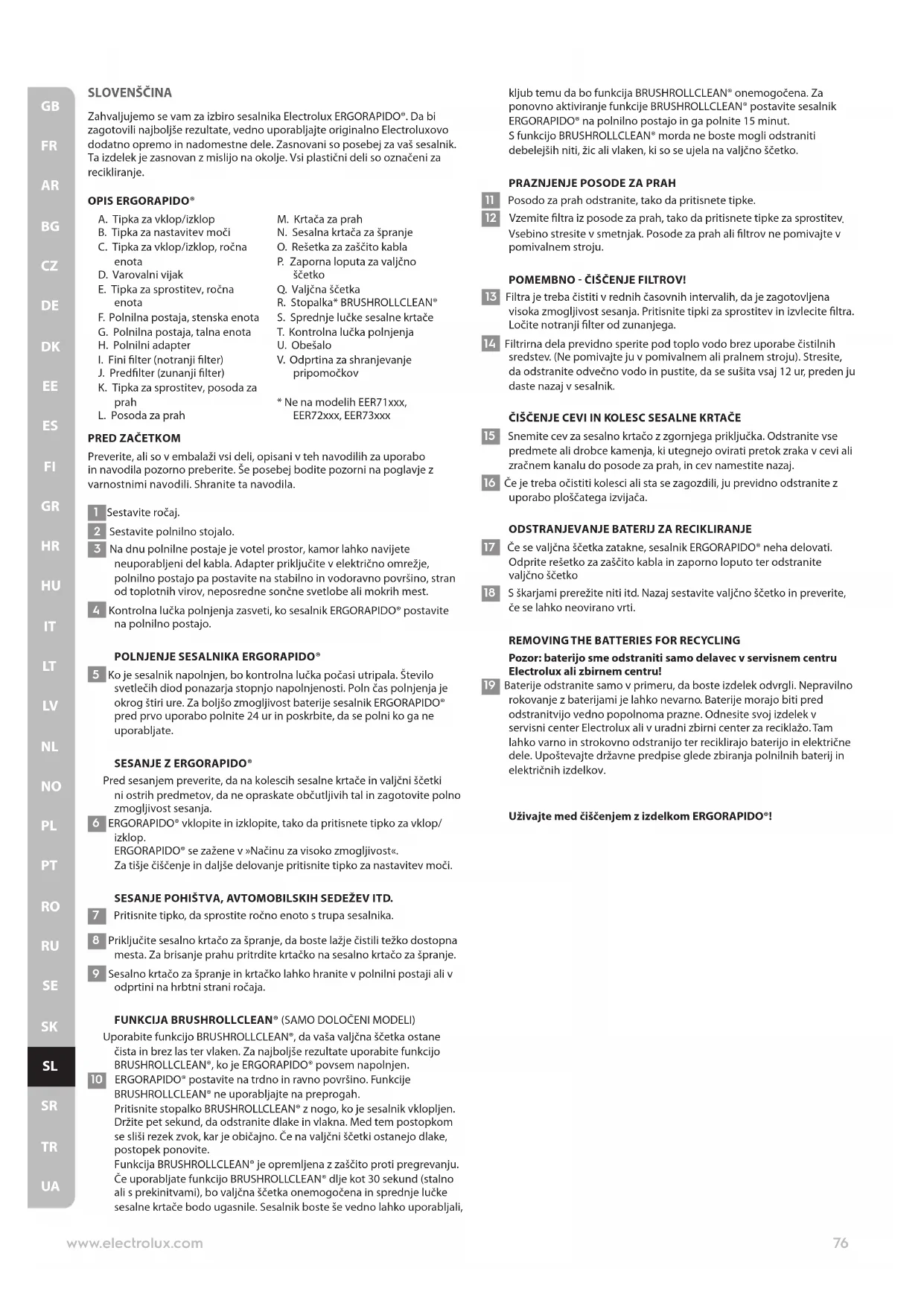Pozor: baterijo sme odstraniti samo delavec v servisnem centru Electrolux ali zbirnem centru! 19 Baterije odstranite samo v primeru, da boste izdelek odvrgli. Nepravilno rokovanje z baterijami je lahko nevarno. Baterije morajo biti pred odstranitvijo vedno popolnoma prazne. Odnesite svoj izdelek v servisni center Electrolux ali v uradni zbirni center za reciklažo. Tam lahko varno in strokovno odstranijo ter reciklirajo baterijo in električne dele. Upoštevajte državne predpise glede zbiranja polnilnih baterij in električnih izdelkov. Uživajte med čiščenjem z izdelkom ERGORAPIDO®! 76www.electrolux.com