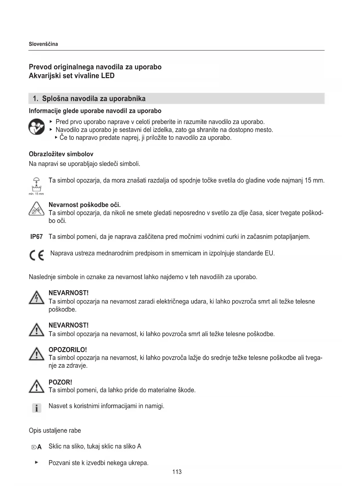 Informacije glede uporabe navodil za uporabo ▶ Pred prvo uporabo naprave v celoti preberite in razumite navodilo za uporabo. ▶ Navodilo za uporabo je sestavni del izdelka, zato ga shranite na dostopno mesto. ▶ Če to napravo predate naprej, ji priložite to navodilo za uporabo. Obrazložitev simbolov Na napravi se uporabljajo sledeči simboli. Ta simbol opozarja, da mora znašati razdalja od spodnje točke svetila do gladine vode najmanj 15 mm. Nevarnost poškodbe oči. Ta simbol opozarja, da nikoli ne smete gledati neposredno v svetilo za dlje časa, sicer tvegate poškod- bo oči. Ta simbol pomeni, da je naprava zaščitena pred močnimi vodnimi curki in začasnim potapljanjem. Naprava ustreza mednarodnim predpisom in smernicam in izpolnjuje standarde EU. Naslednje simbole in oznake za nevarnost lahko najdemo v teh navodilih za uporabo. NEVARNOST! Ta simbol opozarja na nevarnost zaradi električnega udara, ki lahko povzroča smrt ali težke telesne poškodbe. NEVARNOST! Ta simbol opozarja na nevarnost, ki lahko povzroča smrt ali težke telesne poškodbe. OPOZORILO! Ta simbol opozarja na nevarnost, ki lahko povzroča lažje do srednje težke telesne poškodbe ali tvega- nje za zdravje. POZOR! Ta simbol pomeni, da lahko pride do materialne škode. Nasvet s koristnimi informacijami in namigi. Opis ustaljene rabe Sklic na sliko, tukaj sklic na sliko A Pozvani ste k izvedbi nekega ukrepa. min. 15 mm IP67 ⌦A114 Slovenščina