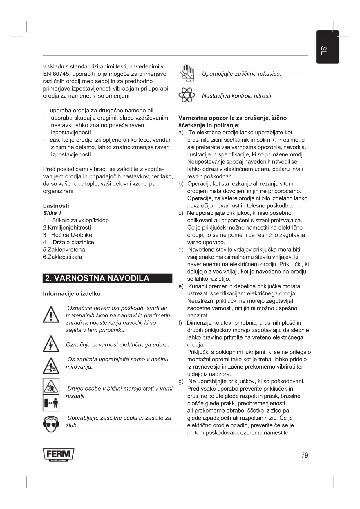 h) Nosite profesionalno zašcitno opremo. Gledena applikacijo, uporabite vizir za predel obraza, varnostna očala ali šcitnik. Če je potrebno, si namestite protiprašno masko, zašcitno za sluh rokavice in delovnpo pbleko, ki zagotavlja zašcitopred drobnimi letecimi delci. Zašcita za očimora zagotavlji varovanje pred letecimi delci ki nastanejo pri različnih postopkih. Respirator protiprašne maske mora zagotavlji filtracið drobnih delcev, ki nastajajo med obratovanjem. Daljsa izpostavljenost prekomernemu hrupu lahko povzroči poskodbe slusnih organov.