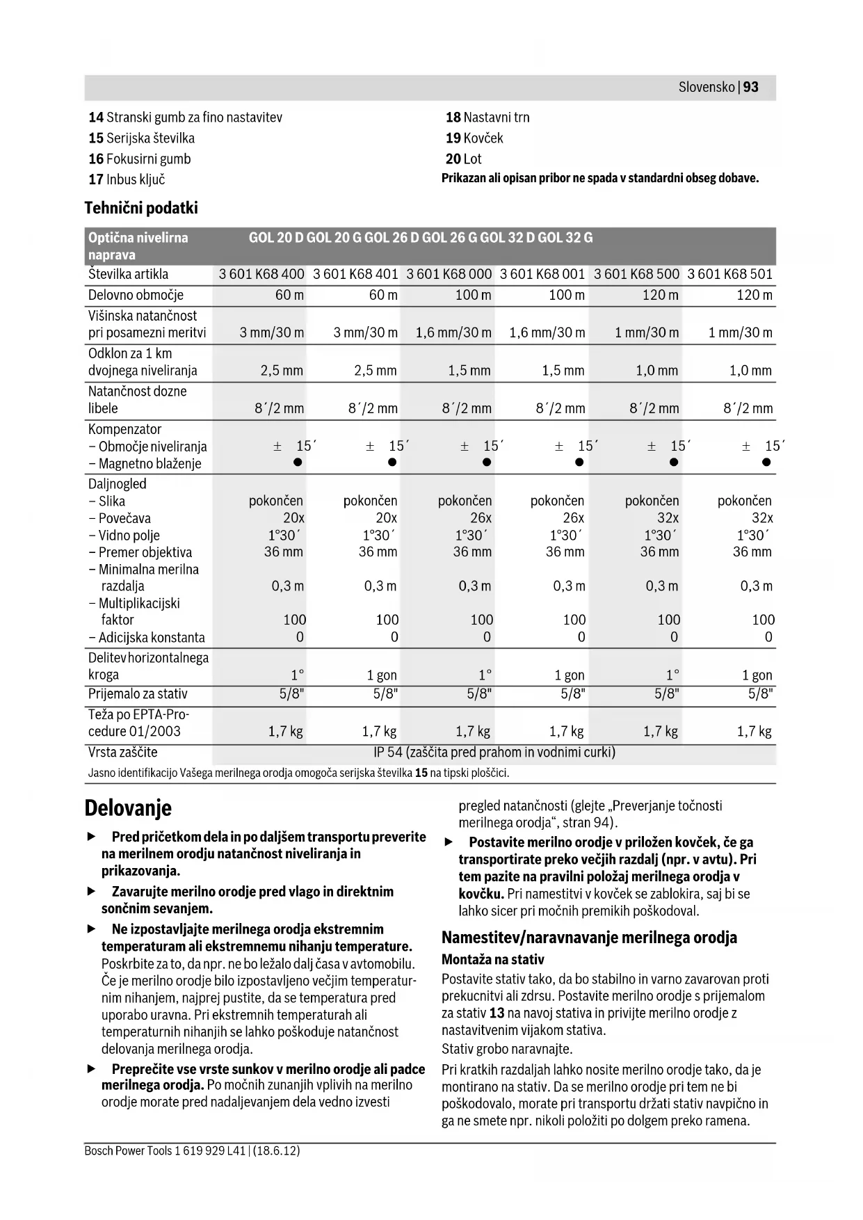 OBJ_BUCH-1239-002.book Page 92 Monday, June 18, 2012 10:51 AMSlovensko | 93 Bosch Power Tools 1 619 929 L41 | (18.6.12) 14 Stranski gumb za fino nastavitev 15 Serijska številka 16 Fokusirni gumb 17 Inbus ključ 18 Nastavni trn 19 Kovček 20 Lot Prikazan ali opisan pribor ne spada v standardni obseg dobave. Tehnični podatki Delovanje f Pred pričetkom dela in po daljšem transportu preverite na merilnem orodju natančnost niveliranja in prikazovanja. f Zavarujte merilno orodje pred vlago in direktnim sončnim sevanjem. f Ne izpostavljajte merilnega orodja ekstremnim temperaturam ali ekstremnemu nihanju temperature. Poskrbite za to, da npr. ne bo ležalo dalj časa v avtomobilu. Če je merilno orodje bilo izpostavljeno večjim temperatur- nim nihanjem, najprej pustite, da se temperatura pred uporabo uravna. Pri ekstremnih temperaturah ali temperaturnih nihanjih se lahko poškoduje natančnost delovanja merilnega orodja. f Preprečite vse vrste sunkov v merilno orodje ali padce merilnega orodja. Po močnih zunanjih vplivih na merilno orodje morate pred nadaljevanjem dela vedno izvesti pregled natančnosti (glejte „Preverjanje točnosti merilnega orodja“, stran 94). f Postavite merilno orodje v priložen kovček, če ga transportirate preko večjih razdalj (npr. v avtu). Pri tem pazite na pravilni položaj merilnega orodja v kovčku. Pri namestitvi v kovček se zablokira, saj bi se lahko sicer pri močnih premikih poškodoval. Namestitev/naravnavanje merilnega orodja Montaža na stativ Postavite stativ tako, da bo stabilno in varno zavarovan proti prekucnitvi ali zdrsu. Postavite merilno orodje s prijemalom za stativ 13 na navoj stativa in privijte merilno orodje z nastavitvenim vijakom stativa. Stativ grobo naravnajte. Pri kratkih razdaljah lahko nosite merilno orodje tako, da je montirano na stativ. Da se merilno orodje pri tem ne bi poškodovalo, morate pri transportu držati stativ navpično in ga ne smete npr. nikoli položiti po dolgem preko ramena. Optična nivelirna naprava GOL 20 D GOL 20 G GOL 26 D GOL 26 G GOL 32 D GOL 32 G Številka artikla 3 601 K68 400 3 601 K68 401 3 601 K68 000 3 601 K68 001 3 601 K68 500 3 601 K68 501 Delovno območje 60 m 60 m 100 m 100 m 120 m 120 m Višinska natančnost pri posamezni meritvi 3 mm/30 m 3 mm/30 m 1,6 mm/30 m 1,6 mm/30 m 1 mm/30 m 1 mm/30 m Odklon za 1 km dvojnega niveliranja 2,5 mm 2,5 mm 1,5 mm 1,5 mm 1,0 mm 1,0 mm Natančnost dozne libele 8´/2 mm 8´/2 mm 8´/2 mm 8´/2 mm 8´/2 mm 8´/2 mm Kompenzator – Območje niveliranja – Magnetno blaženje ± 15´