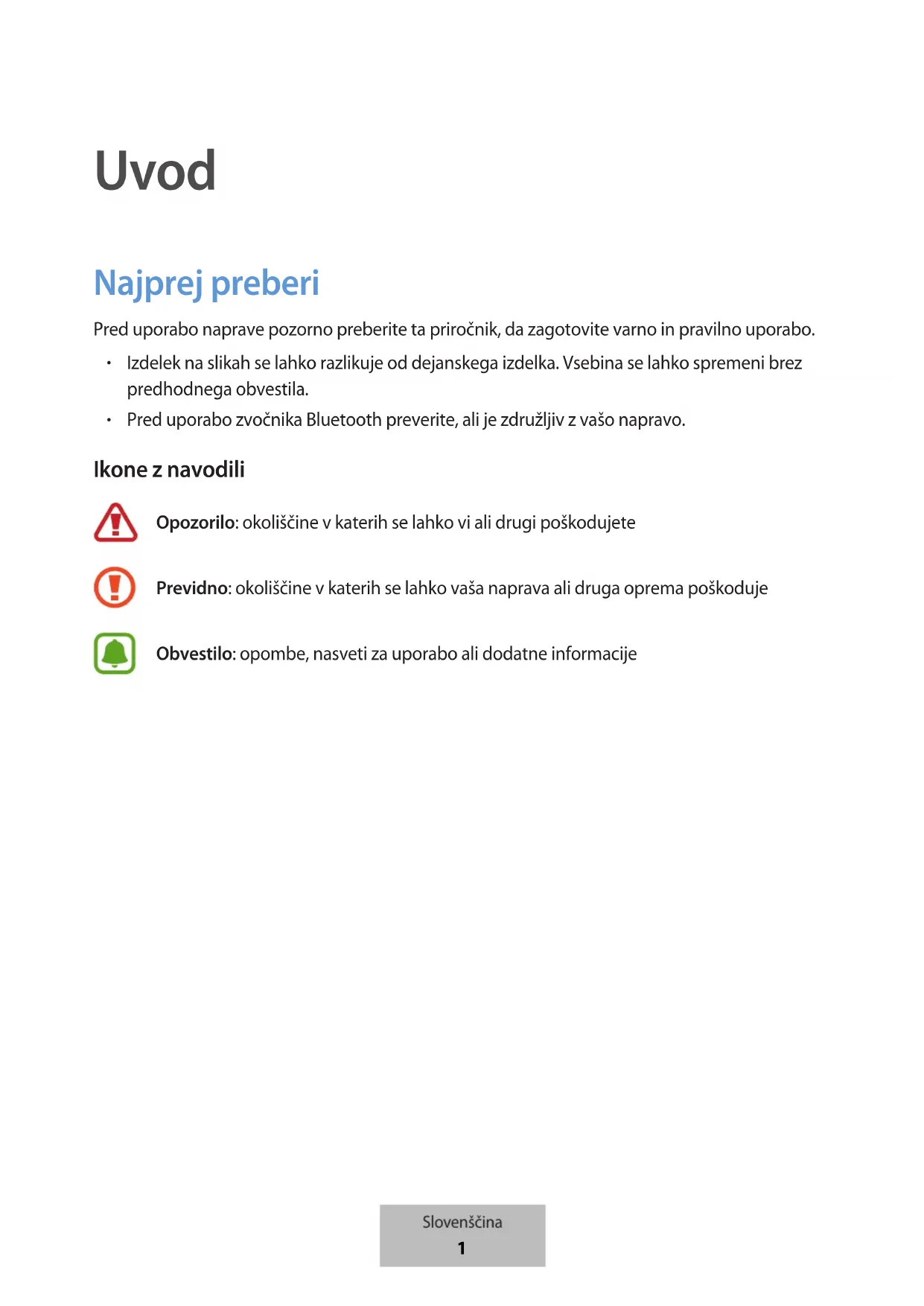 Pred uporabo zvočnika Bluetooth preverite, ali je združljiv z vašo napravo. Ikone z navodili Opozorilo: okoliščine v katerih se lahko vi ali drugi poškodujete Previdno: okoliščine v katerih se lahko vaša naprava ali druga oprema poškoduje Obvestilo: opombe, nasveti za uporabo ali dodatne informacije Slovenščina 1Uvod