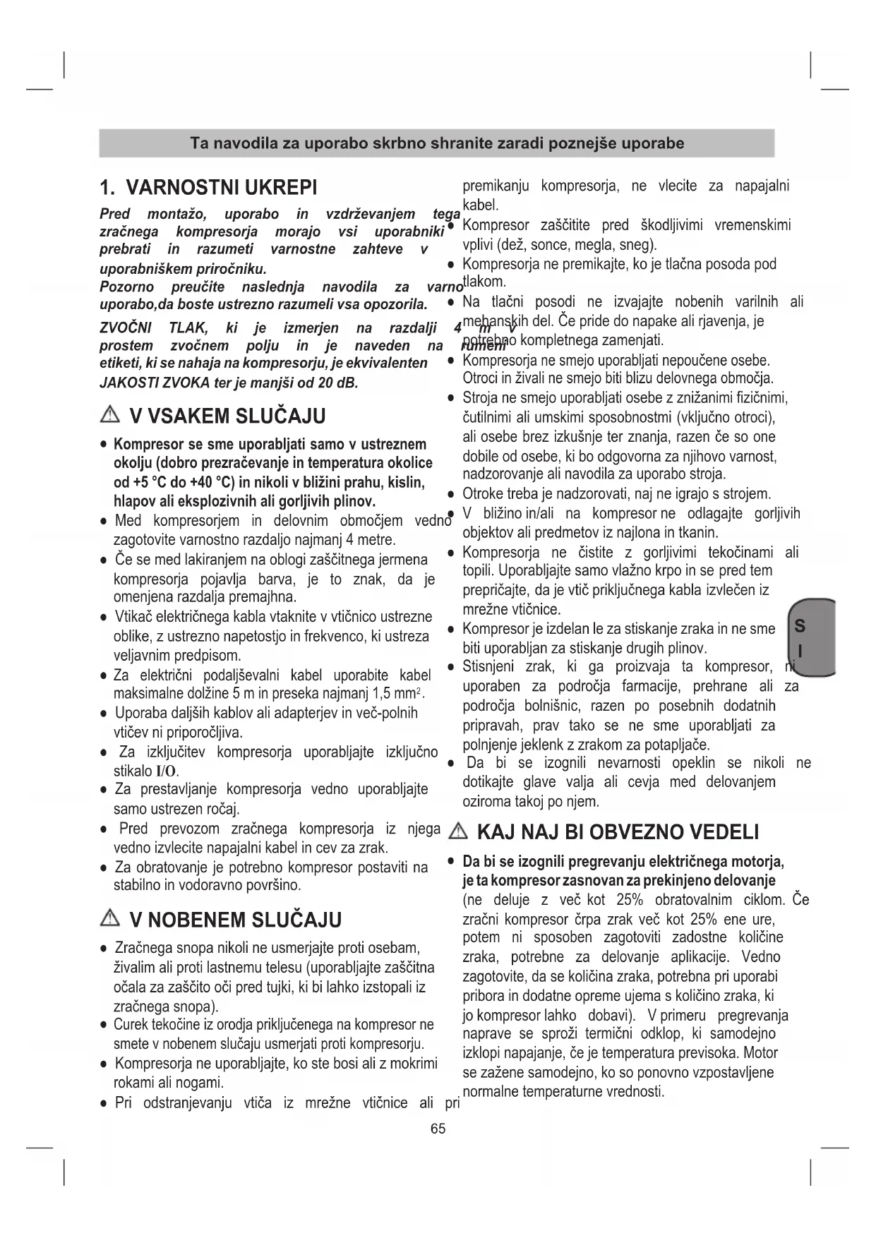 Pred montažo, uporabo in vzdrževanjem tega zračnega kompresorja morajo vsi uporabniki prebrati in razumeti varnostne zahteve v uporabniškempriročniku. Pozorno preučite naslednja navodila za varno uporabo,da boste ustrezno razumeli vsa opozorila. ZVOČNI TLAK, ki je izmerjen na razdalji 4 m v prostem zvočnem polju in je naveden na rumeni etiketi, ki se nahaja na kompresorju, je ekvivalenten JAKOSTIZVOKAterjemanjšiod20dB.