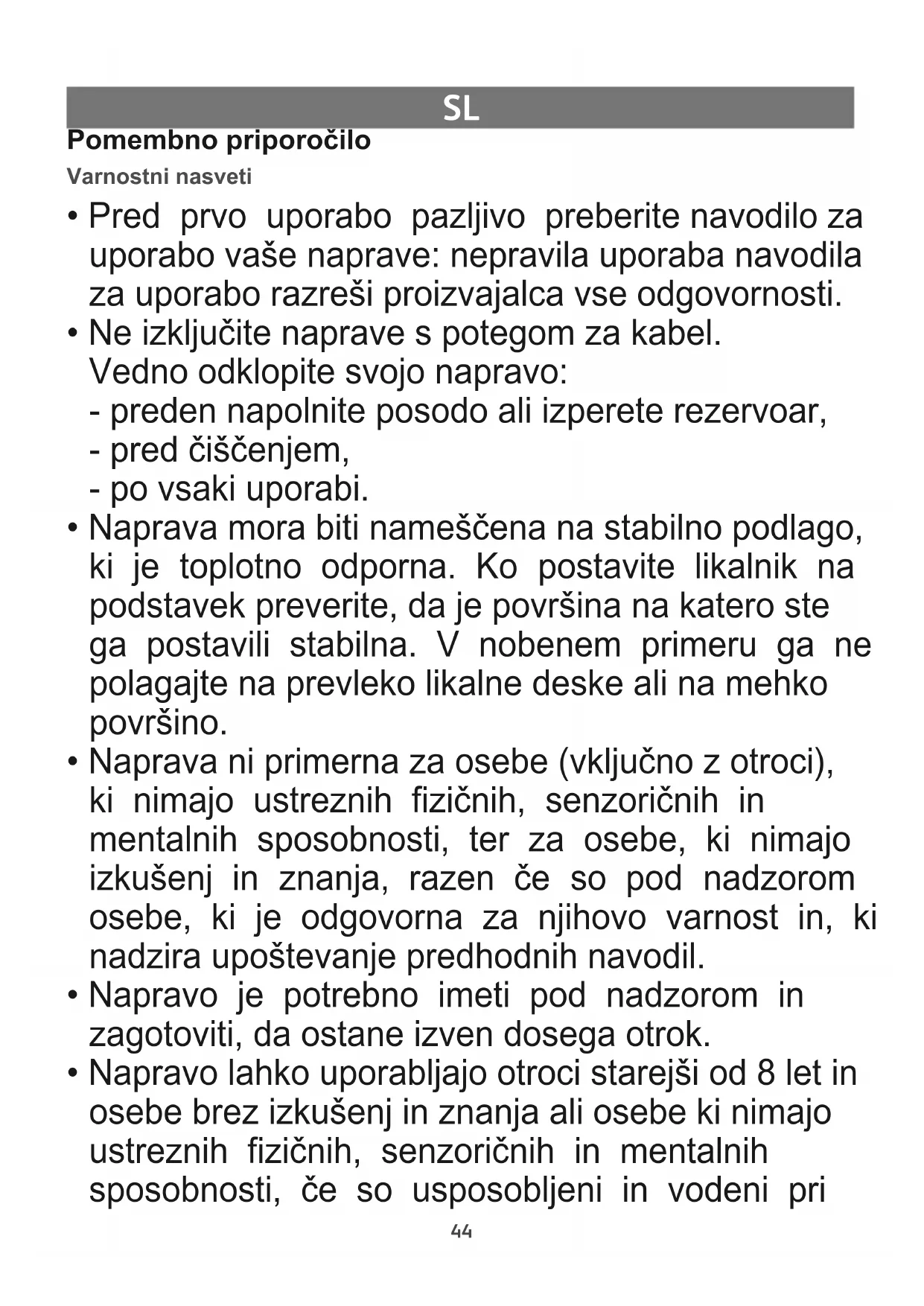 - Naprava ni primerna za osebe (vključno z otroci), ki nimajo ustreznih fizičnih, senzoričnih in mentalnih sposobnosti, ter za osebe, ki nimajo izkušenj in znanja, razen če so pod nadzorom osebe, ki je odgovorna za njihovo varnost in, ki nadzira upoštevanje predhodnih navodil.