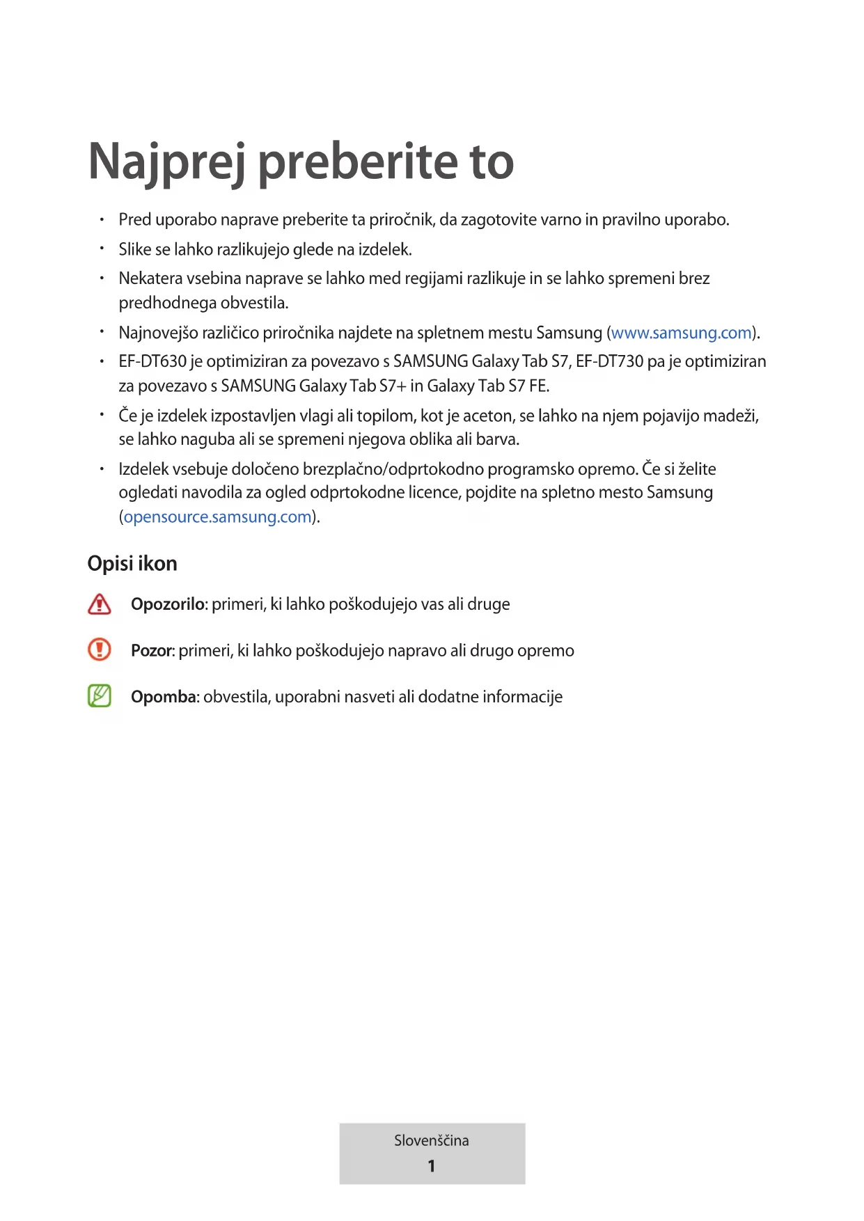 Izdelek vsebuje določeno brezplačno/odprtokodno programsko opremo. Če si želite ogledati navodila za ogled odprtokodne licence, pojdite na spletno mesto Samsung (opensource.samsung.com). Opisi ikon Opozorilo: primeri, ki lahko poškodujejo vas ali druge Pozor: primeri, ki lahko poškodujejo napravo ali drugo opremo Opomba: obvestila, uporabni nasveti ali dodatne informacije
