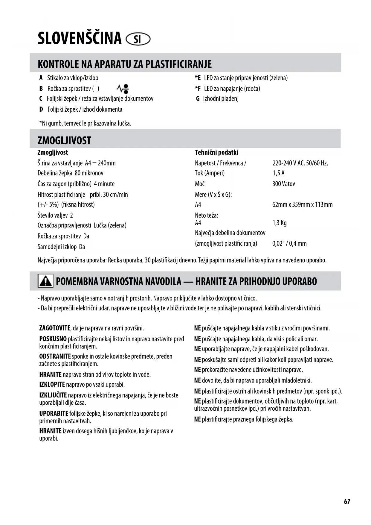 POMEMBNA VARNOSTNA NAVODILA — HRANITE ZA PRIHODNJO UPORABO A Stikalo za vklop/izklop B Ročka za sprostitev ( ) C Folijski žepek / reža za vstavljanje dokumentov D Folijski žepek / izhod dokumenta *E LED za stanje pripravljenosti (zelena) *F LED za napajanje (rdeča) G Izhodni pladenj ZMOGLJIVOST Zmogljivost Širina za vstavljanje A4 = 240mm Debelina žepka 80 mikronov Čas za zagon (približno) 4 minute Hitrost plasticiranje pribl. 30 cm/min (+/- 5%) (ksna hitrost) Število valjev 2 Označba pripravljenosti Lučka (zelena) Ročka za sprostitev Da Samodejni izklop Da Tehnični podatki Napetost / Frekvenca / 220-240 V AC, 50/60 Hz, Tok (Amperi) 1,5 A Moč 300 Vatov Mere (V x Š x G): A4 62mm x 359mm x 113mm Neto teža: A4 1,3 Kg Največja debelina dokumentov (zmogljivost plasticiranja) 0,02” / 0,4mm - Napravo uporabljajte samo v notranjih prostorih. Napravo priključite v lahko dostopno vtičnico. - Da bi preprečili električni udar, naprave ne uporabljajte v bližini vode ter je ne polivajte po napravi, kablih ali stenski vtičnici. SLOVENŠČINA