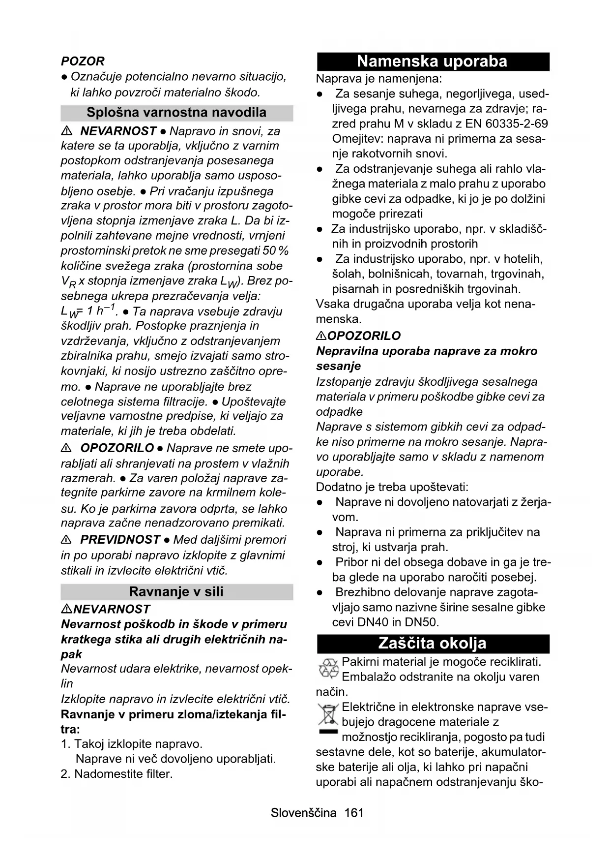- Izjava EU o skladnosti Slovenščina 161 POZOR ● Označuje potencialno nevarno situacijo, ki lahko povzroči materialno škodo. Splošna varnostna navodila NEVARNOST ● Napravo in snovi, za katere se ta uporablja, vključno z varnim postopkom odstranjevanja posesanega materiala, lahko uporablja samo usposo- bljeno osebje. ● Pri vračanju izpušnega zraka v prostor mora biti v prostoru zagoto- vljena stopnja izmenjave zraka L. Da bi iz- polnili zahtevane mejne vrednosti, vrnjeni prostorninski pretok ne sme presegati 50 % količine svežega zraka (prostornina sobe p. 168