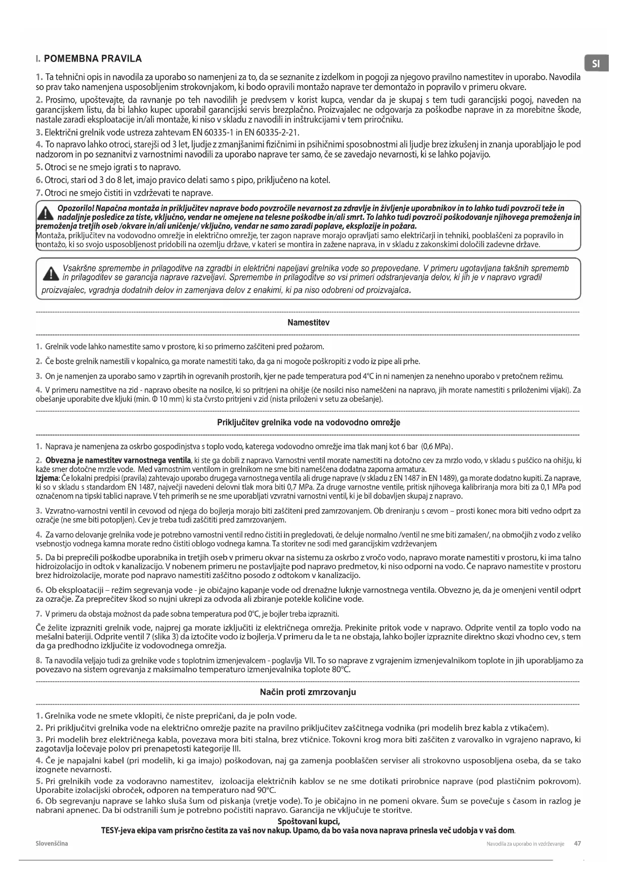 2. Pri priključitvi grelnika vode na električno omrežje pazite na pravilno priključitev zaščitnega vodnika (pri modelih brez kabla z vtikačem). 3. Pri modelih brez električnega kabla, povezava mora biti stalna, brez vtičnice. Tokovni krog mora biti zaščiten z varovalko in vgrajeno napravo, ki zagotavlja ločevaje polov pri prenapetosti kategorije III. 4. Če je napajalni kabel (pri modelih, ki ga imajo) poškodovan, naj ga zamenja pooblaščen serviser ali strokovno usposobljena oseba, da se tako izognete nevarnosti. 5. Pri grelnikih vode za vodoravno namestitev, izoloacija električnih kablov se ne sme dotikati prirobnice naprave (pod plastičnim pokrovom). Uporabite izolacijski obroček, odporen na temperaturo nad 90°C. 6. Ob segrevanju naprave se lahko sluša šum od piskanja (vretje vode). To je običajno in ne pomeni okvare. Šum se povečuje s časom in razlog je nabrani apnenec. Da bi odstranili šum je potrebno počistiti napravo. Garancija ne vključuje te storitve. Spoštovani kupci, TESY-jeva ekipa vam prisrčno čestita za vaš nov nakup. Upamo, da bo vaša nova naprava prinesla več udobja v vaš dom.48 Navodila za uporabo in vzdrževanje