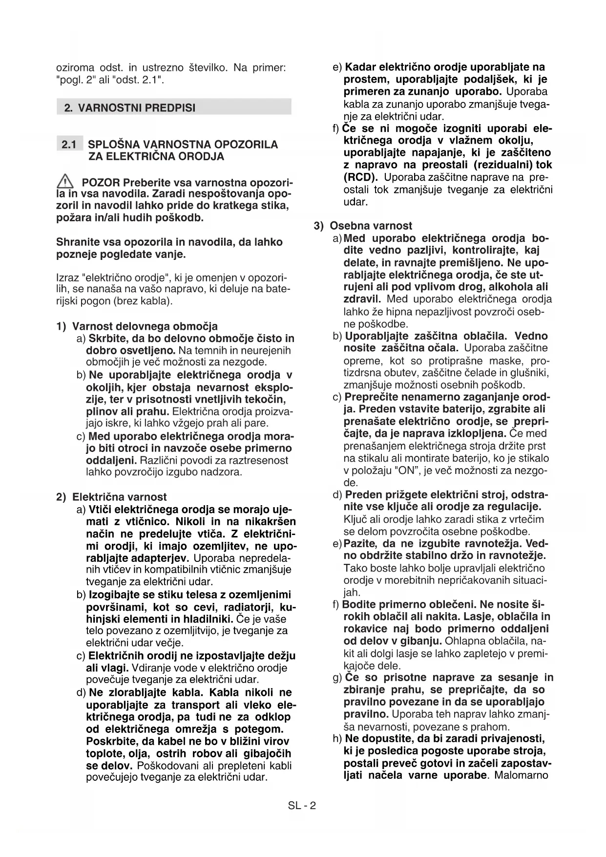 a) Skrbite, da bo delovno območje čisto in dobro osvetljeno. Na temnih in neurejenih območjih je več možnosti za nezgode. b) Ne uporabljajte električnega orodja v okoljih, kjer obstaja nevarnost eksplo- zije, ter v prisotnosti vnetljivih tekočin, plinov ali prahu. Električna orodja proizva- jajo iskre, ki lahko vžgejo prah ali pare. c) Med uporabo električnega orodja mora- jo biti otroci in navzoče osebe primerno oddaljeni. Različni povodi za raztresenost lahko povzročijo izgubo nadzora.