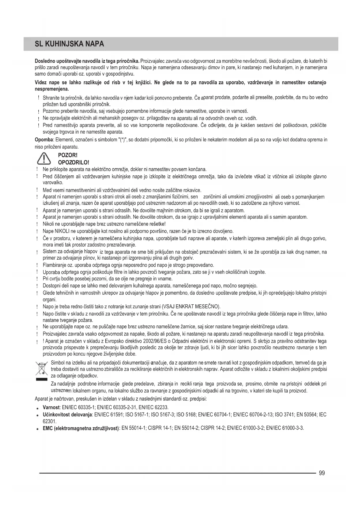 Dosledno upoštevajte navodila iz tega priročnika. Proizvajalec zavrača vso odgovornost za morebitne nevšečnosti, škodo ali požare, do katerih bi prišlo zaradi neupoštevanja navodil v tem priročniku. Napa je namenjena odsesavanju dimov in pare, ki nastanejo med kuhanjem, in je namenjena samo domači uporabi oz. uporabi v gospodinjstvu. Videz nape se lahko razlikuje od risb v tej knjižici. Ne glede na to pa navodila za uporabo, vzdrževanje in namestitev ostanejo nespremenjena. Shranite ta priročnik, da lahko navodila v njem kadar koli ponovno preberete. Če a parat prodate, podarite ali preselite, poskrbite, da mu bo vedno priložen tudi uporabniški priročnik. Pozorno preberite navodila, saj vsebujejo pomembne informacije glede namestitve, uporabe in varnosti. Ne opravljajte električnih ali mehanskih posegov oz. prilag oditev na aparatu ali na odvodnih ceveh oz. vodih. Pred namestitvijo aparata preverite, ali so vse komponente nepoškodovane. Če odkrijete, da je kakšen sestavni del poškodovan, pokličite svojega trgovca in ne namestite aparata. Opomba: Elementi, označeni s simbolom "(*)", so dodatni pripomočki, ki so priloženi le nekaterim modelom ali pa so na voljo kot dodatna oprema in niso priloženi aparatu. POZOR! OPOZ ORILO! Ne priklopite aparata na električno omrežje, dokler ni namestitev povsem končana. Pred čiščenjem ali vzdrževanjem kuhinjske nape jo izklopite iz električnega omrežja, tako da izvlečete vtikač iz vtičnice ali izklopite glavno varovalko. Med vsemi namestitvenimi ali vzdrževalnimi deli vedno nosite zaščitne rokavice. Aparat ni namenjen uporabi s strani otrok ali oseb z zmanjšanimi fizičnimi, sen zoričnimi ali umskimi zmogljivostmi ali oseb s pomanjkanjem izkušenj ali znanja, razen če aparat uporabljajo pod ustreznim nadzorom ali po navodilih oseb, ki so zadolžene za njihovo varnost. Aparat je namenjen uporabi s strani odraslih. Ne dovolite majhnim otrokom, da bi se igrali z aparatom. Aparat je namenjen uporabi s strani odraslih. Ne dovolite otrokom, da se igrajo z upravljalnimi elementi a parata ali s samim aparatom. Nikoli ne uporabljajte nape brez ustrezno nameščene rešetke! Nape NIKOLI ne uporabljajte kot nosilno ali podporno površino, razen če je to izrecno dovoljeno. Če v prostoru, v katerem je nameščena kuhinjska napa, uporabljate tudi naprave ali aparate, v katerih izgoreva zemeljski plin ali drugo gorivo, mora imeti tak prostor zadostno prezračevanje. Sistem za odvajanje hlapov iz tega aparata ne sme biti priključen na obstoječ prezračevalni sistem, ki se že uporablja za kak drug namen, na primer za odvajanje plinov, ki nastanejo pri izgorevanju plina ali drugih goriv. Flambiranje oz. uporaba odprtega ognja neposredno pod napo je strogo prepovedano. Uporaba o dprtega ognja poškoduje filtre in lahko povzroči tveganje požara, zato se ji v vseh okoliščinah izognite. Pri cvrtju bodite posebej pozorni, da se olje ne pregreje in vname. Dostopni deli nape se lahko med delovanjem kuhalnega aparata, nameščenega pod napo, močno segrejejo. Glede tehničnih in varnostnih ukrepov za odvajanje hlapov je pomembno, da dosledno upoštevate predpise, ki jih opredeljujejo lokalno pristojni organi. Napo je treba redno čistiti tako z notranje kot zunanje strani (VSAJ ENKRAT MESEČNO). Napo čistite v sk ladu z navodili za vzdrževanje v tem priro čniku. Če ne upoštevate navodil iz tega priročnika glede čiščenja nape in filtrov, lahko nastane tveganje požara. Ne uporabljajte nape oz. ne puščajte nape brez ustrezno nameščene žarnice, saj sicer nastane tveganje električnega udara. Proizvajalec zavrača vsako odgovornost za napake, škodo ali požare, ki nastanejo na aparatu zaradi neupoštevanja navodil iz tega priročnika. ! Aparat je označen v skladu z Evropsko direktivo 2002/96/ES o Odpadni električni in elektronski opremi. S skrbjo za pravilno odstranitev tega proizvoda prispevate k preprečevanju škodljivih posledic za okolje ter zdravje ljudi, ki bi jih sicer lahko povzročilo neustrezno ravnanje s tem proizvodom po koncu njegove življenjske dobe. Simbol na izdelku ali na pripadajoči dokumentaciji o značuje, da z aparatom ne smete ravnati kot z gospodinjskim odpadkom, temveč da ga je treba dostaviti na ustrezno zbirališče za recikliranje električnih in elektronskih naprav. Aparat odložite v skladu z lokalnimi okoljskimi predpisi za odlaganje odpadkov. Za nadaljnje podrobne informacije glede predelave, zbiranja in recikli ranja tega proizvoda se, prosimo, obrnite na pristojni oddelek pri ustrezne m lokalnem organu, na lokalno službo za ravnanje z gospodinjskimi odpadki ali na trgovino, v kateri ste kupili ta proizvod. Aparat je načrtovan, preskušen in izdelan v skladu z naslednjimi standardi oz. predpisi: Varnost: EN/IEC 60335-1; EN/IEC 60335-2-31, EN/IEC 62233. Učinkovitost delovanja: EN/IEC 61591; ISO 5167-1; ISO 5167-3; ISO 5168; EN/IEC 60704-1; EN/IEC 60704-2-13; ISO 3741; EN 50564; IEC